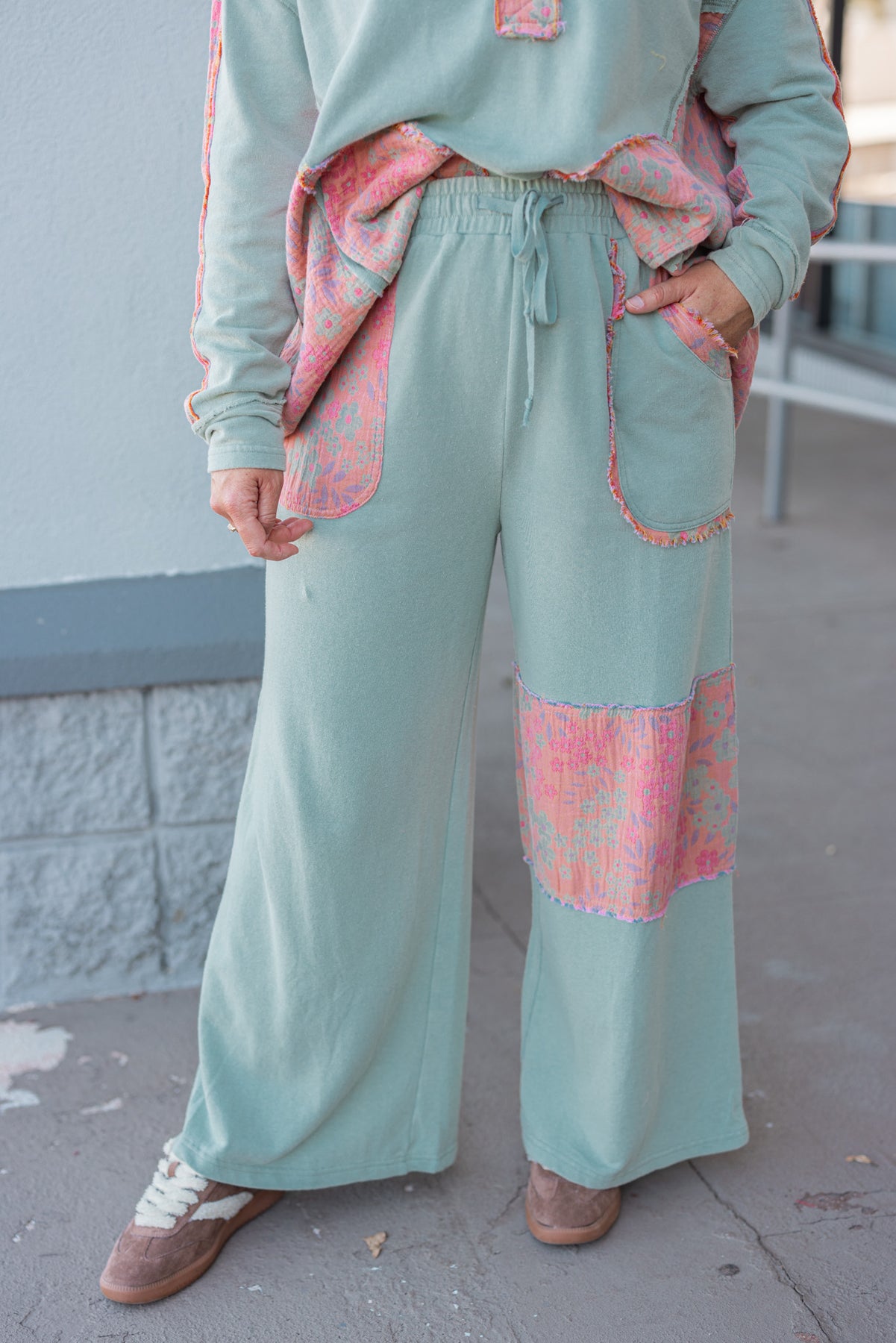 Embrace cozy charm with these sage green French terry knit pants, featuring playful frayed floral gauze patches in pink, lavender, peach, and mint. The drawstring elastic waistband adds a classic touch, while the wide legs bring a fun, whimsical vibe. Perfect for adding a splash of color and comfort to your everyday look! Pair with matching top for a trendy but super comfy outfit!