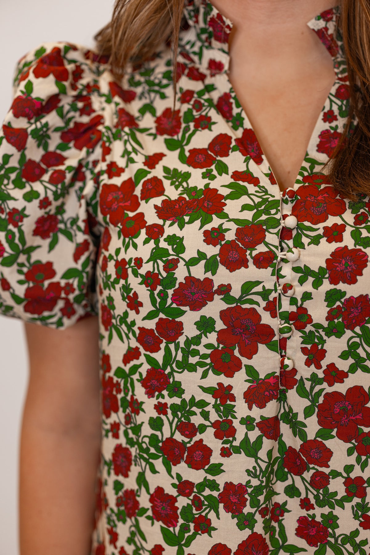 Embrace the charm of fall with this playful Autumn Blooms Ecru Midi Dress! Featuring a delicate burgundy, pink and green floral print on soft ecru fabric, it delights with a button front bodice and flirty v neckline. Puff sleeves add a touch of whimsy, while the ruffled bottom hem dances with every step. Perfect for twirling through crisp autumn days in style!