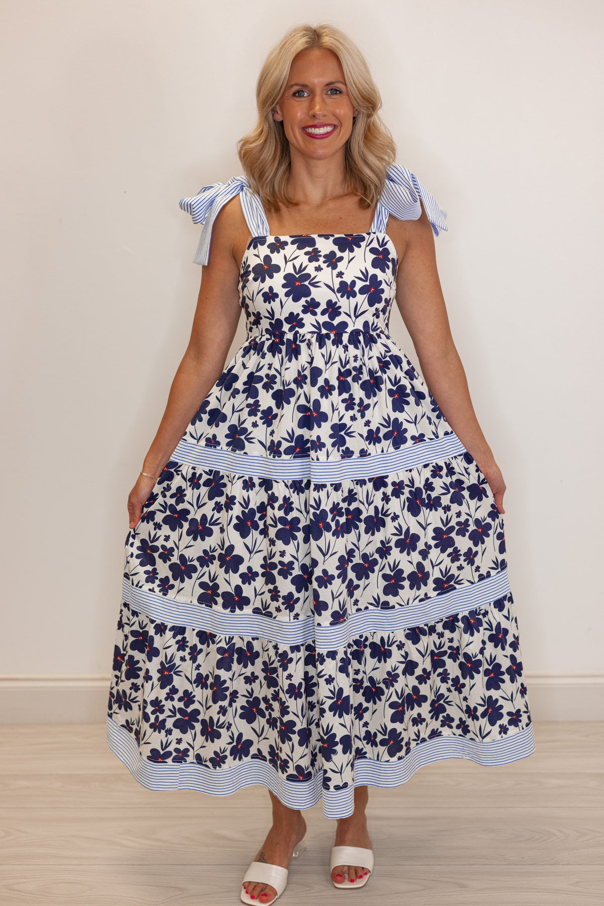 Cream sleeveless tiered midi dress with navy floral print and blue striped trim