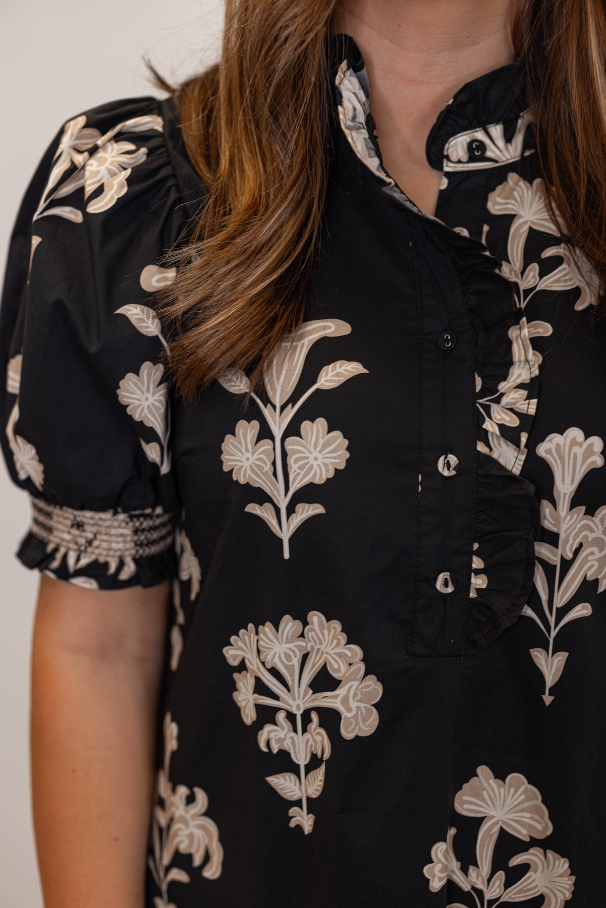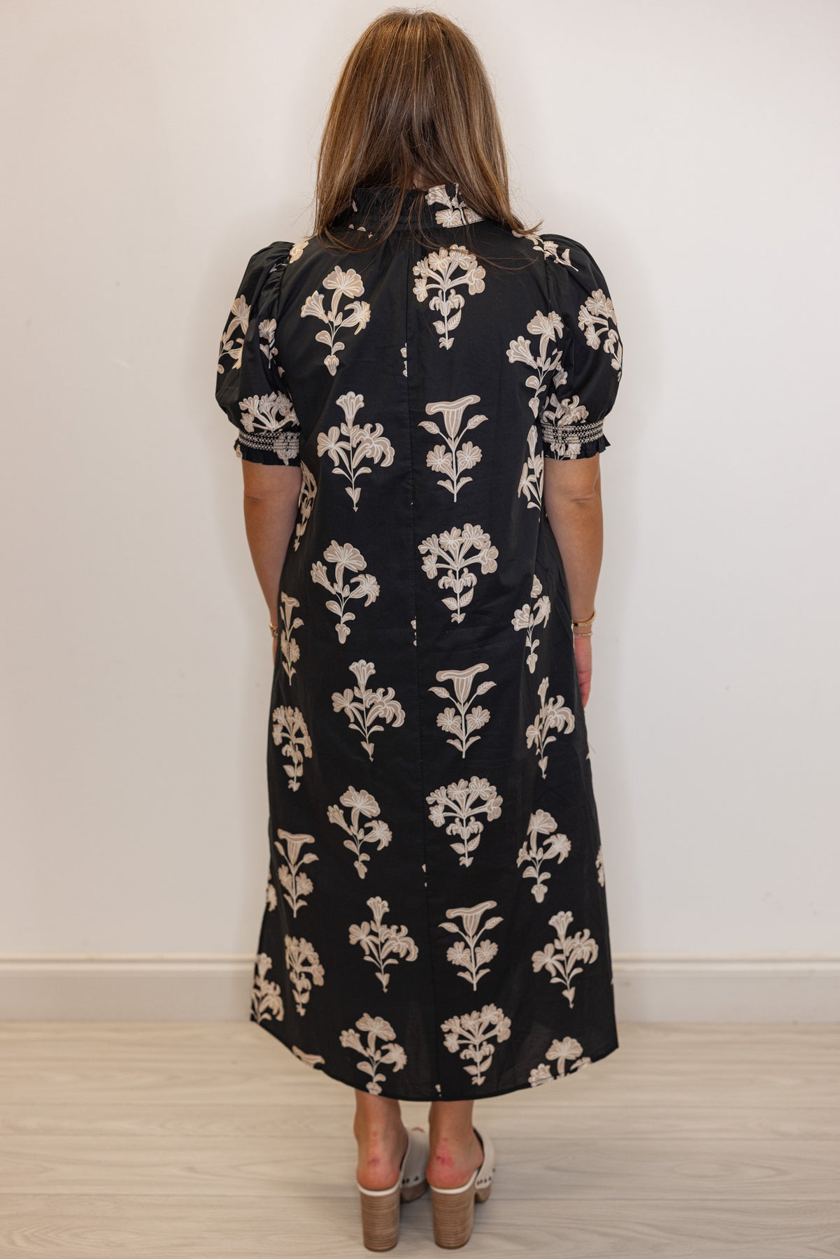 Step into a playful garden of style with the Botanical Symphony Black Midi Dress! Featuring a taupe botanical print on a sleek black background, this dress delights with a ruffled mock neck and a delicate ruffle detail down the bodice. Short puff sleeves add a flirty touch, while side slits in the hem offer easy movement and a hint of whimsy. Perfect for twirling through your day with effortless grace!
