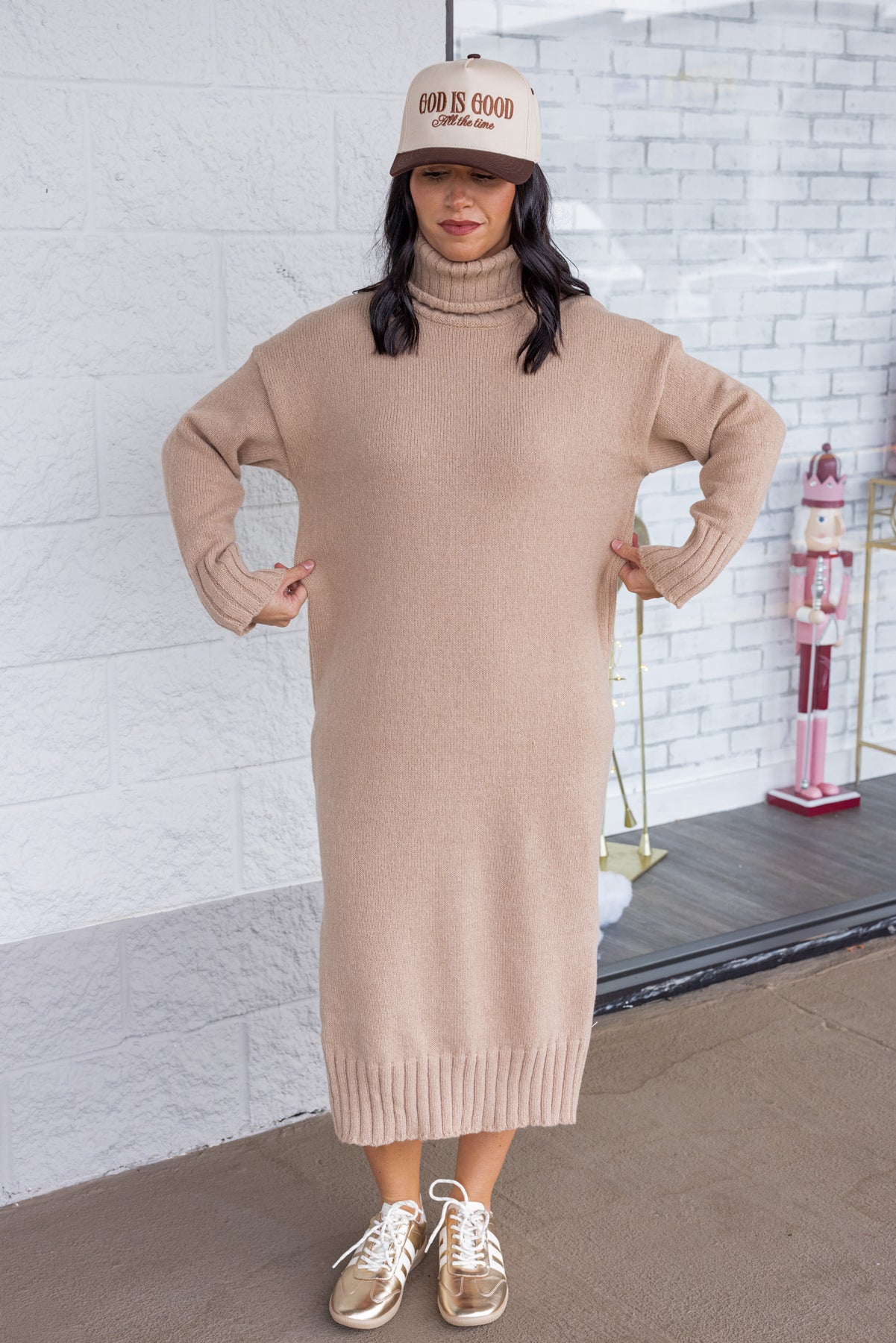 Wrap yourself in full coziness with this charming taupe knit midi sweater dress! The ribbed turtleneck adds timeless appeal, while long sleeves keep you cozy through any season. A ribbed hem with cheeky side slits is the perfect balance between classic and contemporary—practical enough for everyday wear, playful enough to turn heads. Whether you're channeling vintage vibes or creating fresh memories, this piece is your go-to for effortless style that feels like a warm hug! Shop the look: Brown Vest | Hat | Sneakers