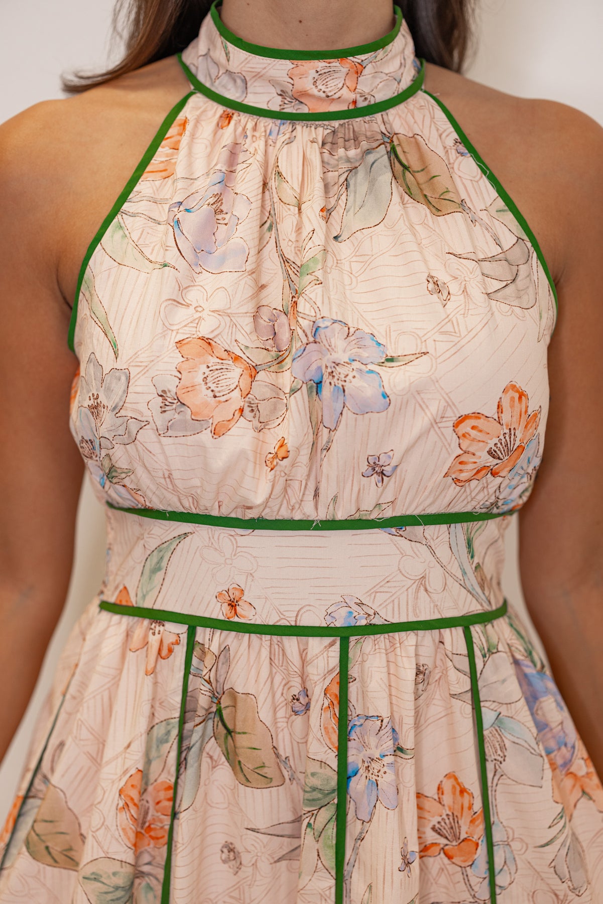 Step into a garden of charm with the Enchanted Blooms Blush Midi Dress! Featuring a delicate blush pink floral print and a flirty halter mock neck, this dress highlights your waist with an empire silhouette. The flowy skirt, accented by fresh green stripes and a playful tulip hem, moves with a breezy grace perfect for sunny days and twirling moments. Embrace effortless style with a touch of whimsy!
