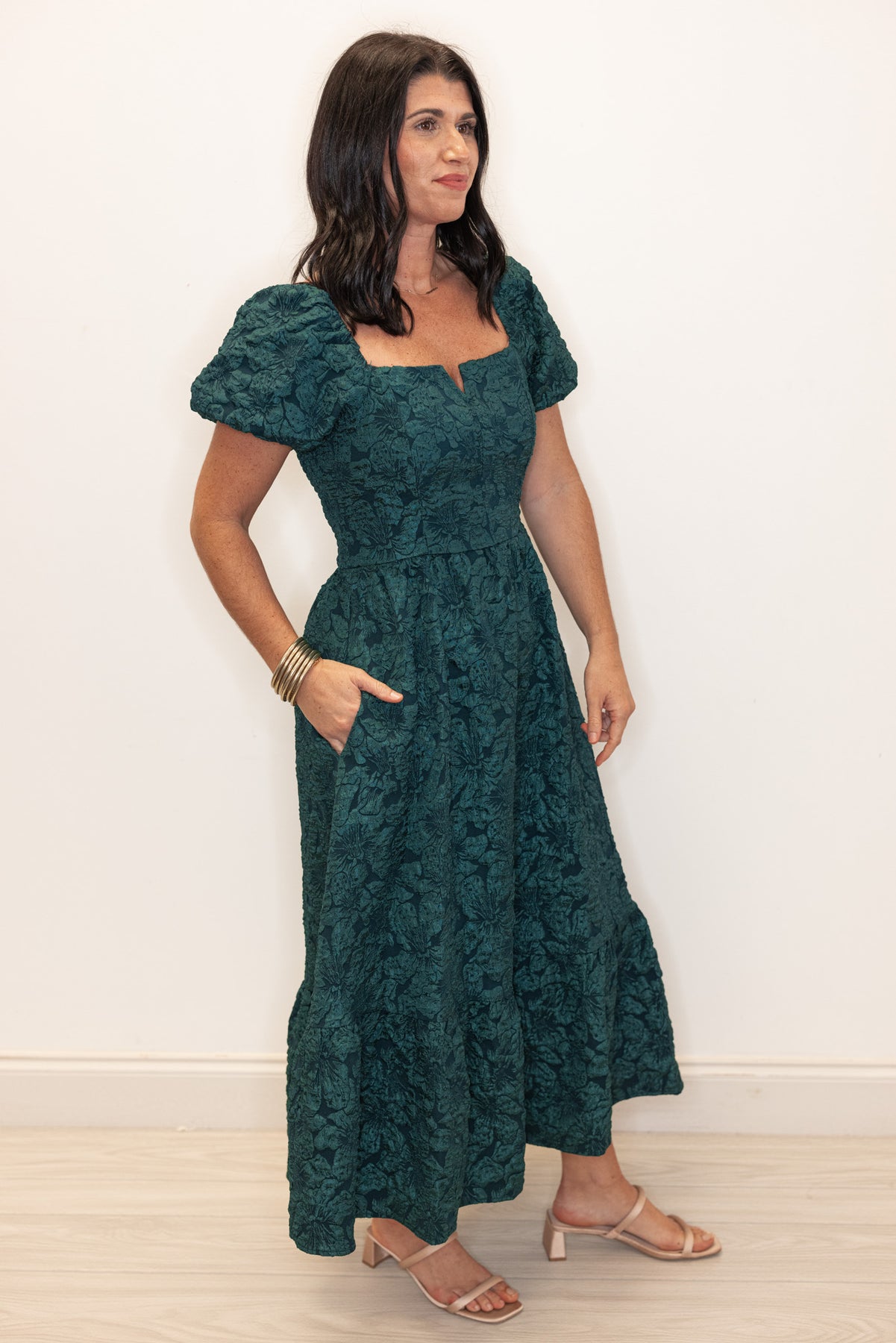 Meet your new favorite dress for every special occasion—the Jacie Jacquard Forest Green Midi Dress. With its rich floral jacquard pattern and flattering midi cut, this dress is perfect for weddings, engagement photos, or festive Christmas portraits.