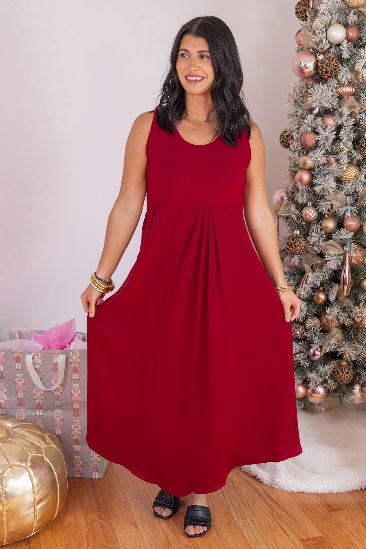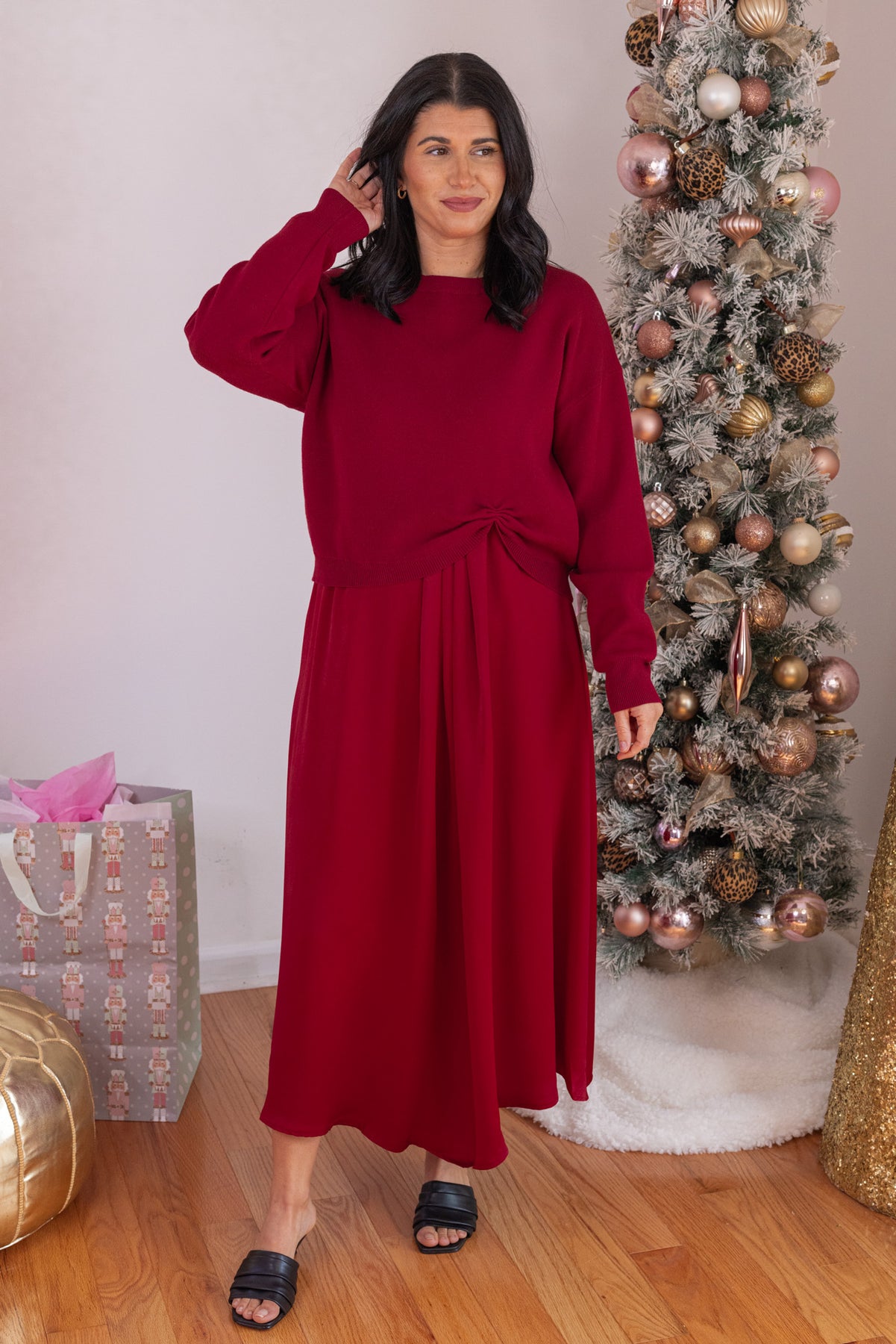 Effortlessly chic and undeniably versatile, this burgundy midi dress combines a soft contrasting fabric top with a luxuriously flowy satin skirt for the perfect mix of polish and movement. The sleeveless design and crew neckline keeps things modern and minimal, while the asymmetrical hemline adds an unexpected twist that catches the eye. Dress it up solo or layer it with the matching Ready Or Knot sweater for a look that's pure elegance with a playful edge!