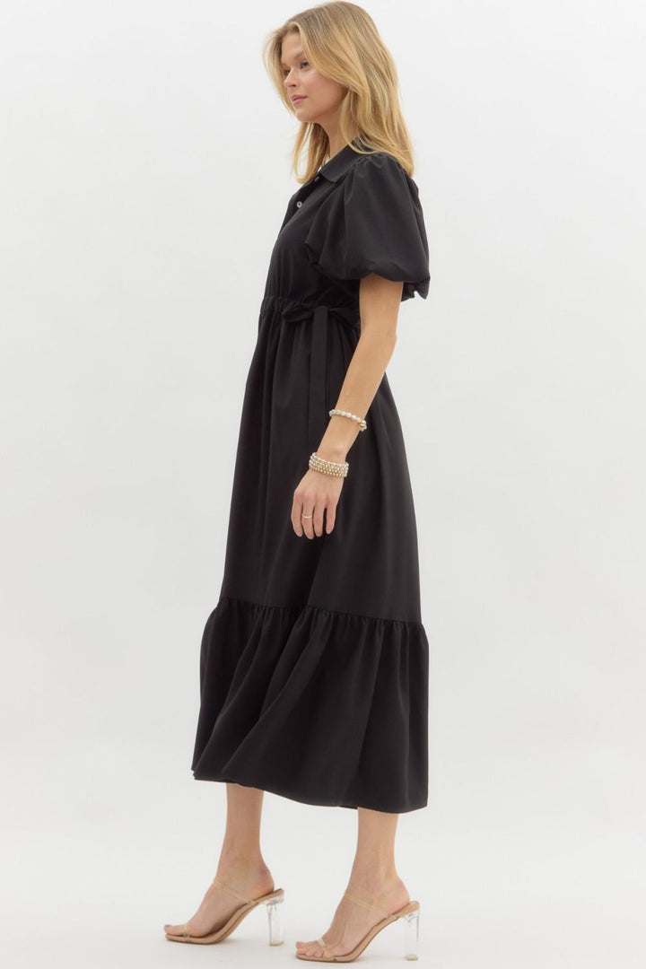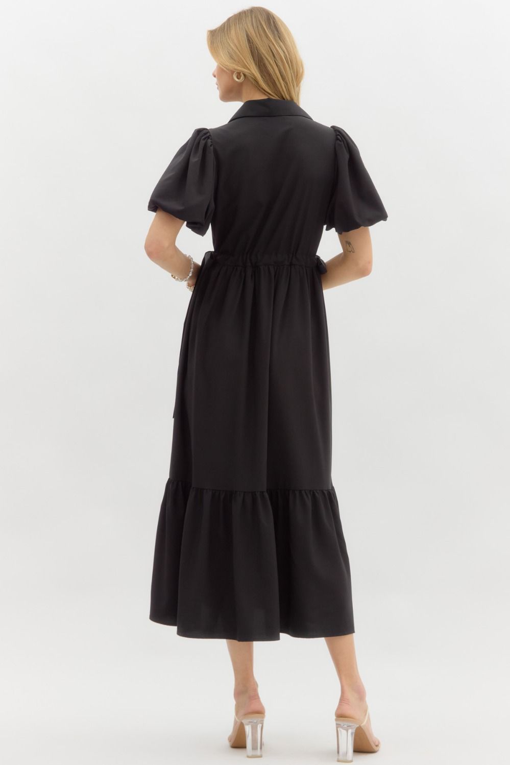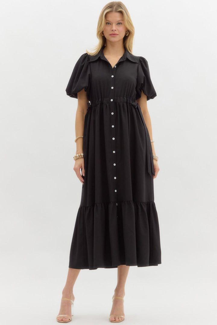Get ready for a Summer Delight in this black midi dress! With a button down front and collar, this dress has a playful and chic look. The puff sleeves add a touch of whimsy, while the adjustable cinch at the waist allows for a flattering fit. Perfect for any occasion!