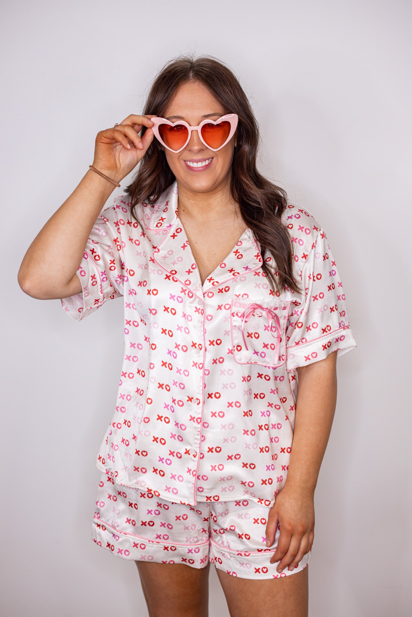 Satin pajamas feel so luxurious! Check out this sweet set, featuring a button down top with a cute bow tie detailed chest pocket, and elastic waist shorts, all in white with a pink and red XO heart print. Perfect for bedtime, or comfy lounging!