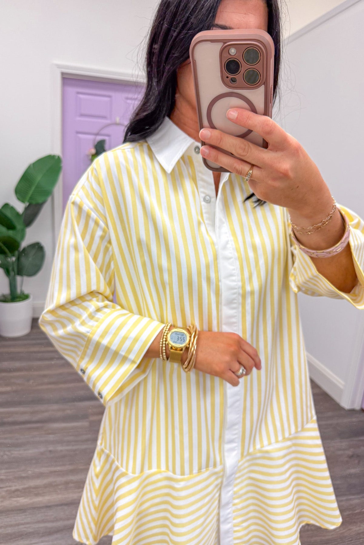 Welcome spring in style with this delightful Hello Sunshine dress! Bursting with cheerful yellow stripes, this playful piece features a convenient button-down front and a twirly tiered skirt that moves with you. Perfect for Easter egg hunts, garden parties, or simply spreading sunshine wherever you go.