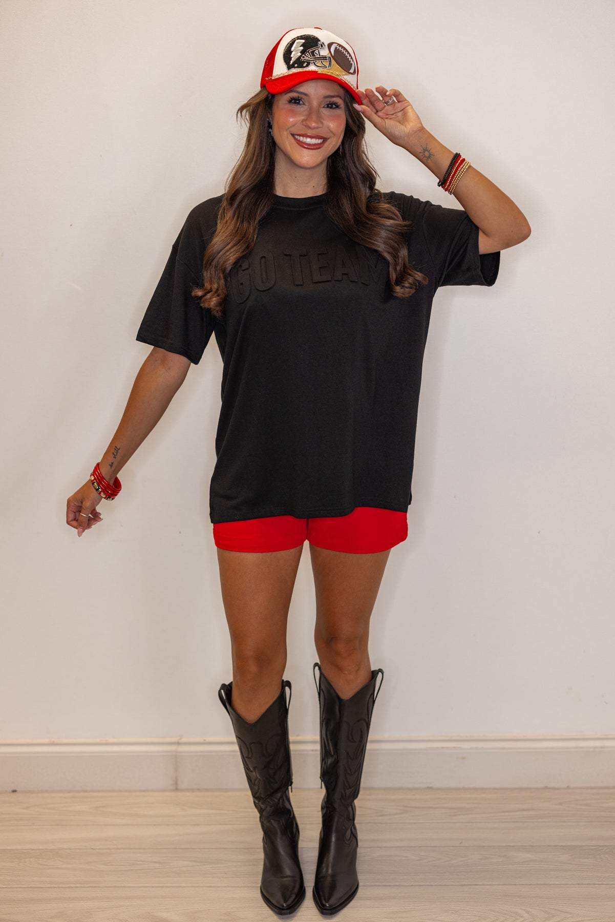 Cheer loud and proud in the Go Team Embossed Black Tee! This lightweight black top offers a relaxed fit with short sleeves and a comfy crew neckline—perfect for any sports fan. The embossed "Go Team" design adds a playful pop that’s sure to catch eyes while you show your team spirit in style. Shop the look: Red Shorts