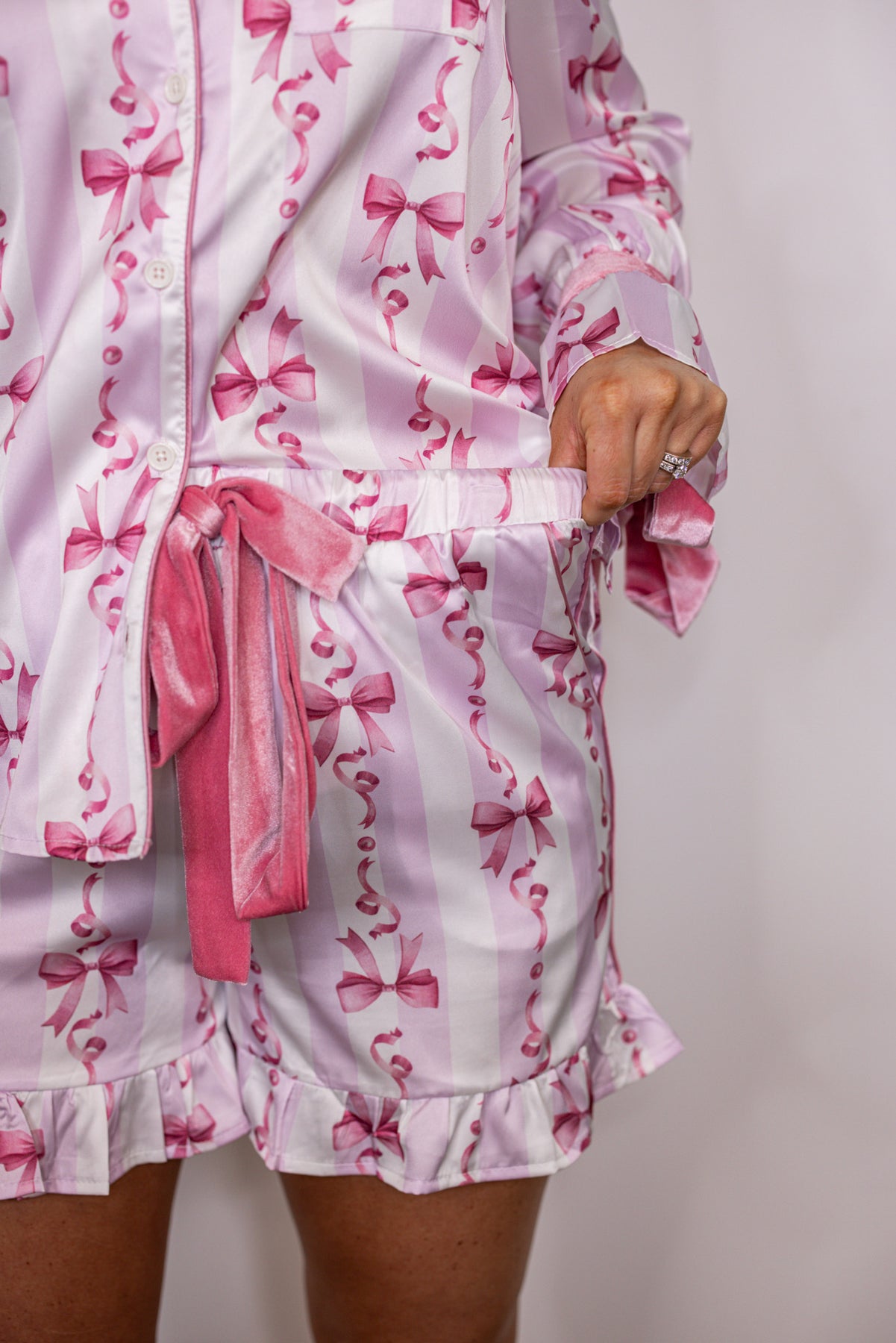 Satin mixed with velvet feels so luxurious! Check out these sweet pajama shorts, with a light pink and white striped fabric covered in pink bow ties. Featuring an elastic waistband with a pink velvet bow tie drawstring, ruffled hem, and pink trim throughout. Perfect for bedtime, or comfy lounging. Grab the matching top and get ready to trend while your sleep!