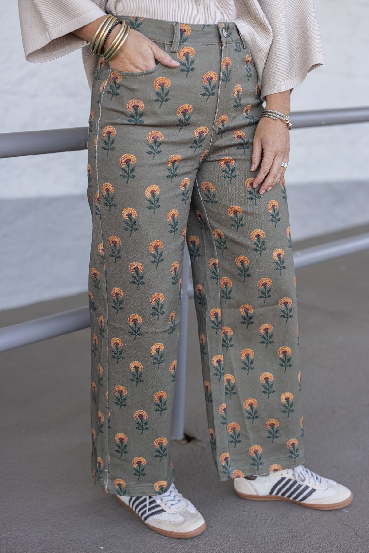 Bring a splash of nature to your wardrobe with the Botanical Harvest Olive Twill Pants. These playful pants feature a charming print on soft, comfortable olive twill fabric, perfect for adding a touch of whimsy to your day. Designed with both fun and function in mind, they offer a relaxed fit that moves with you, whether you’re exploring the outdoors or chilling at your favorite café. Pair them with your favorite tees or cozy sweaters to create effortlessly stylish looks that brighten every moment. Let your outfit blossom with these delightful pants made for everyday adventures. We love with either of these tops: Ivory ribbed top in photos | Chocolate brown knit top