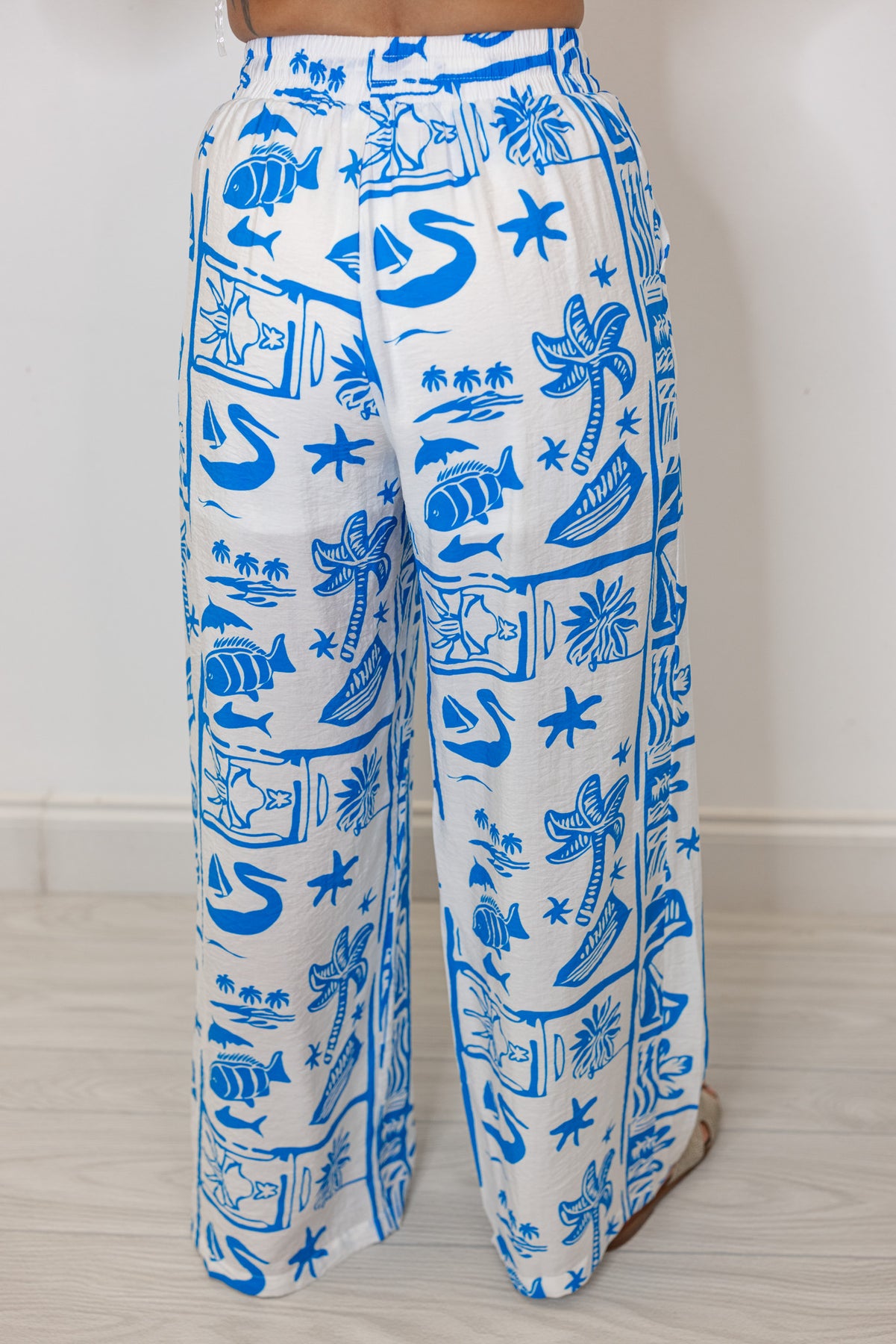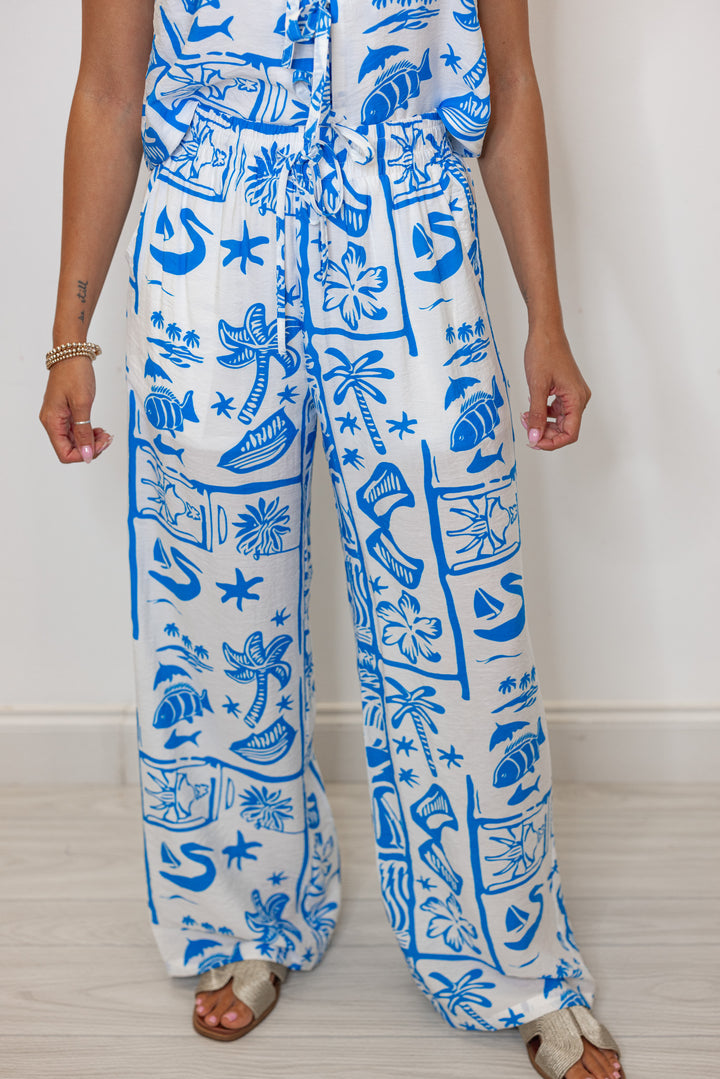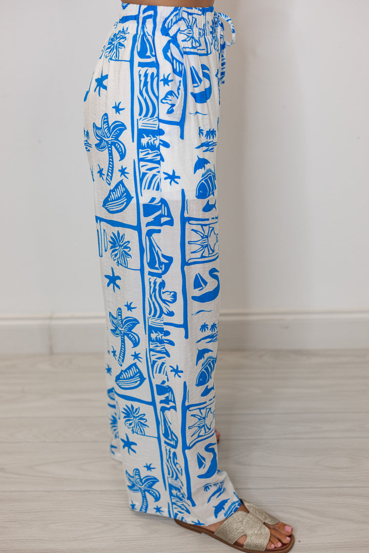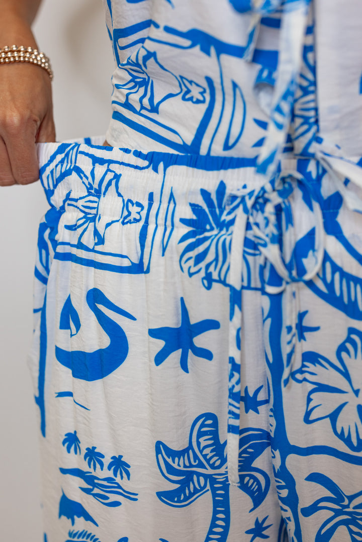 Get ready to dream of the beach with our Castaway Bay Blue Print Pants! Featuring a blue beach print on off white fabric, a drawstring elastic waistband, and wide legs. Perfect for adding a touch of Summer to any day out! Shop the matching top here for the dreamiest outfit around!