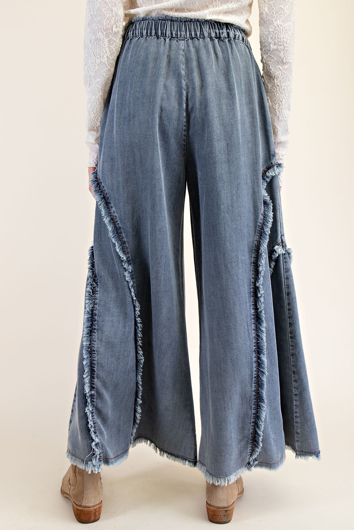 Get ready to add some fun and flair to your wardrobe with our Fringed Denim Blue Palazzo Pants! These washed denim pants feature a drawstring elastic waistband for ultimate comfort, as well as wide legs and playful frayed fringe details throughout. Perfect for adding a unique touch to any day out!