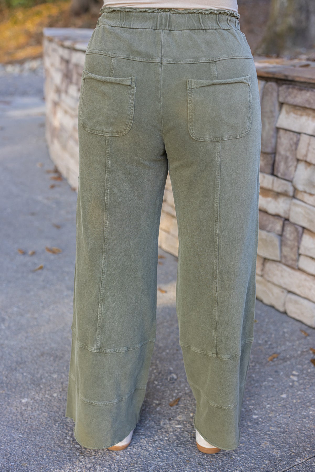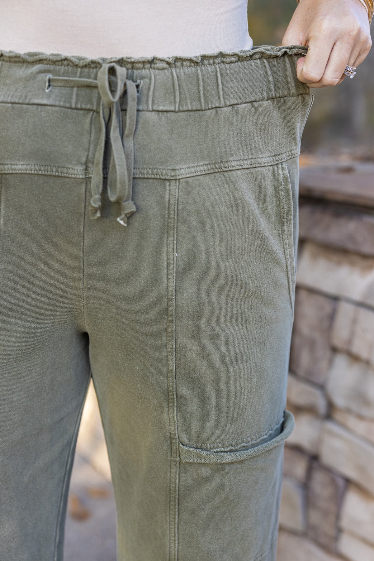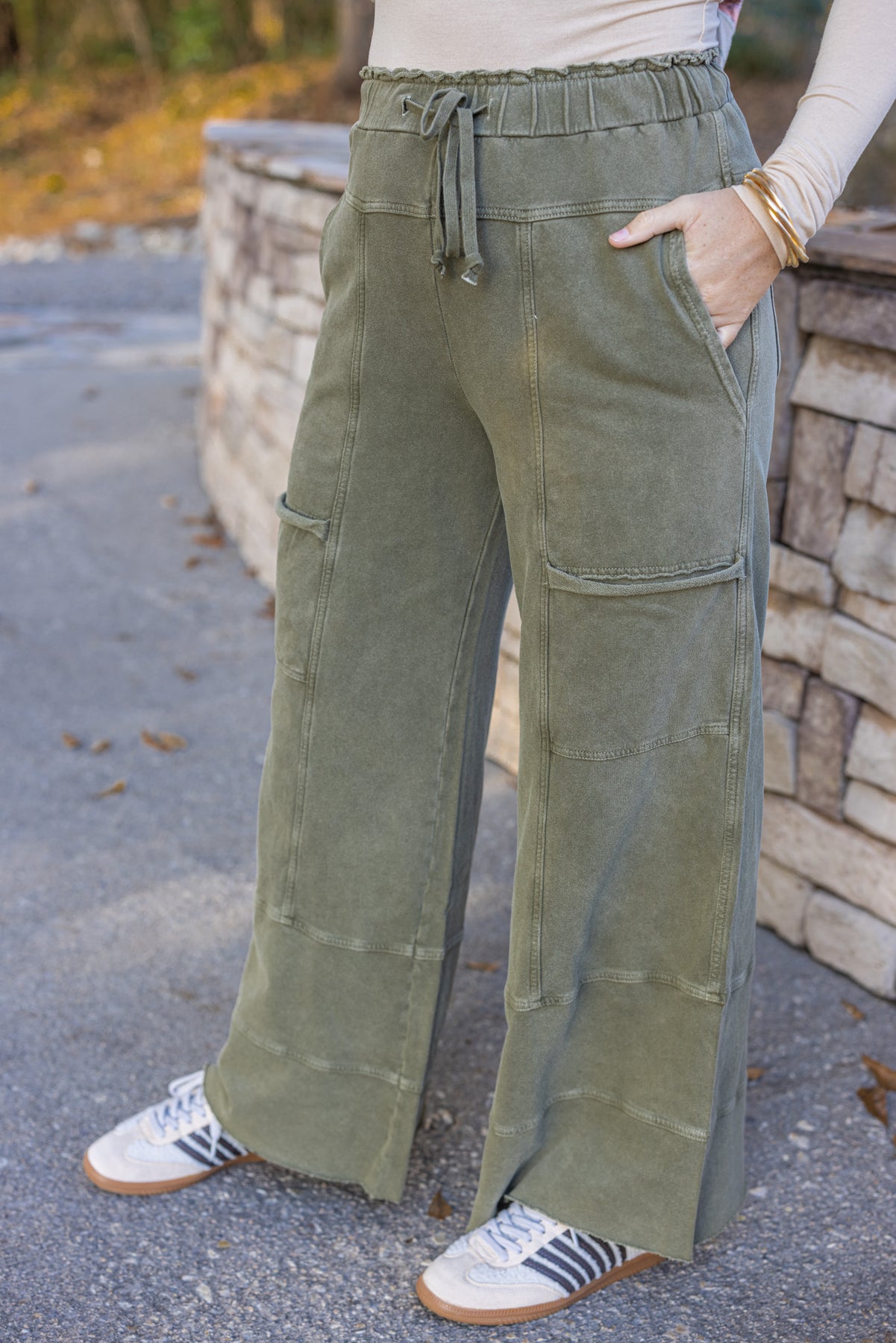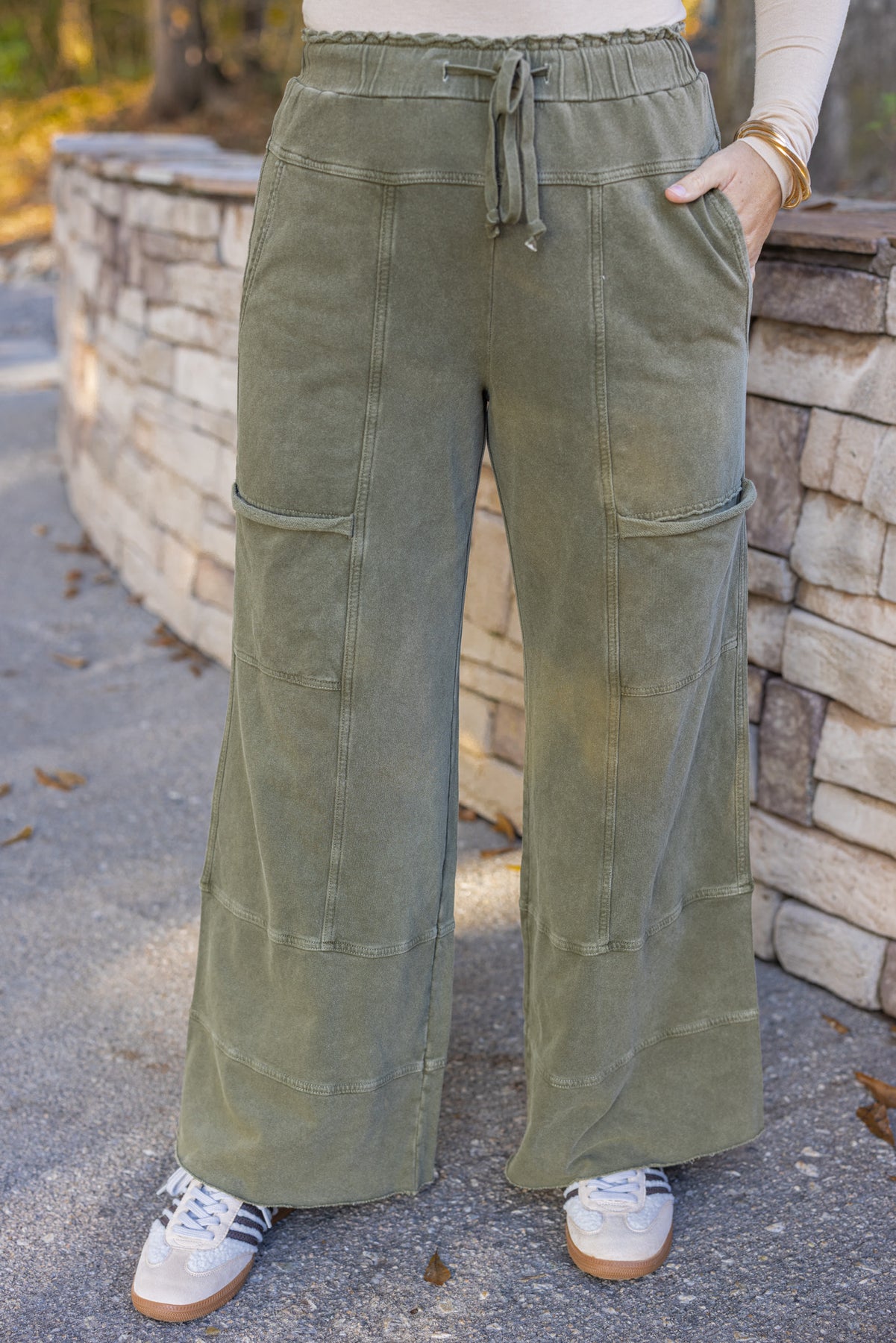 These terry knit pants are both trendy and comfy! Mineral washed olive french terry knit fabric, featuring drawstring elastic waistband, side pockets, front pockets above the knee, back pockets, wide legs, raw bottom hemline, and reverse seam details throughout. The great thing about these pants are how easy they are to style - shop the pictured looks here: Plaid Vest | Printed Sleeve Top