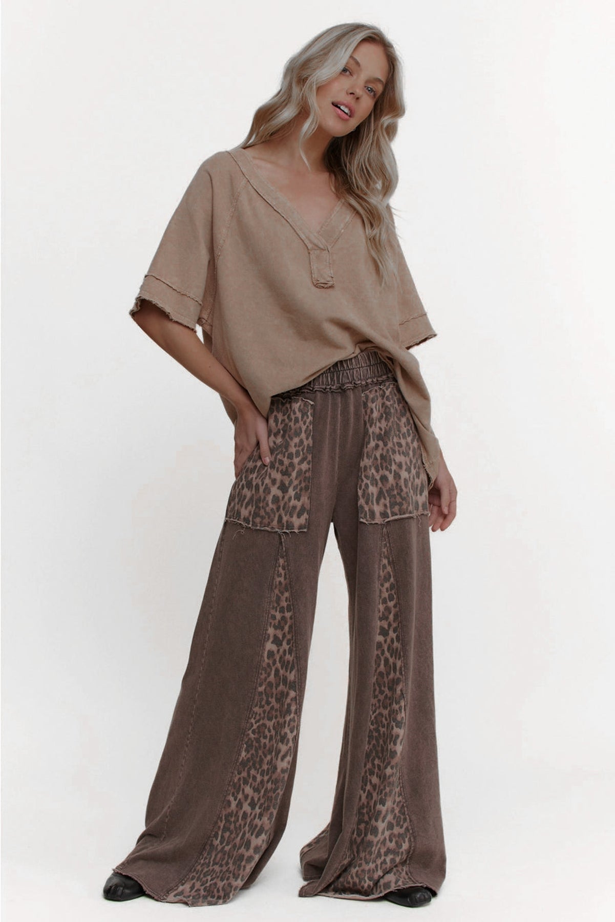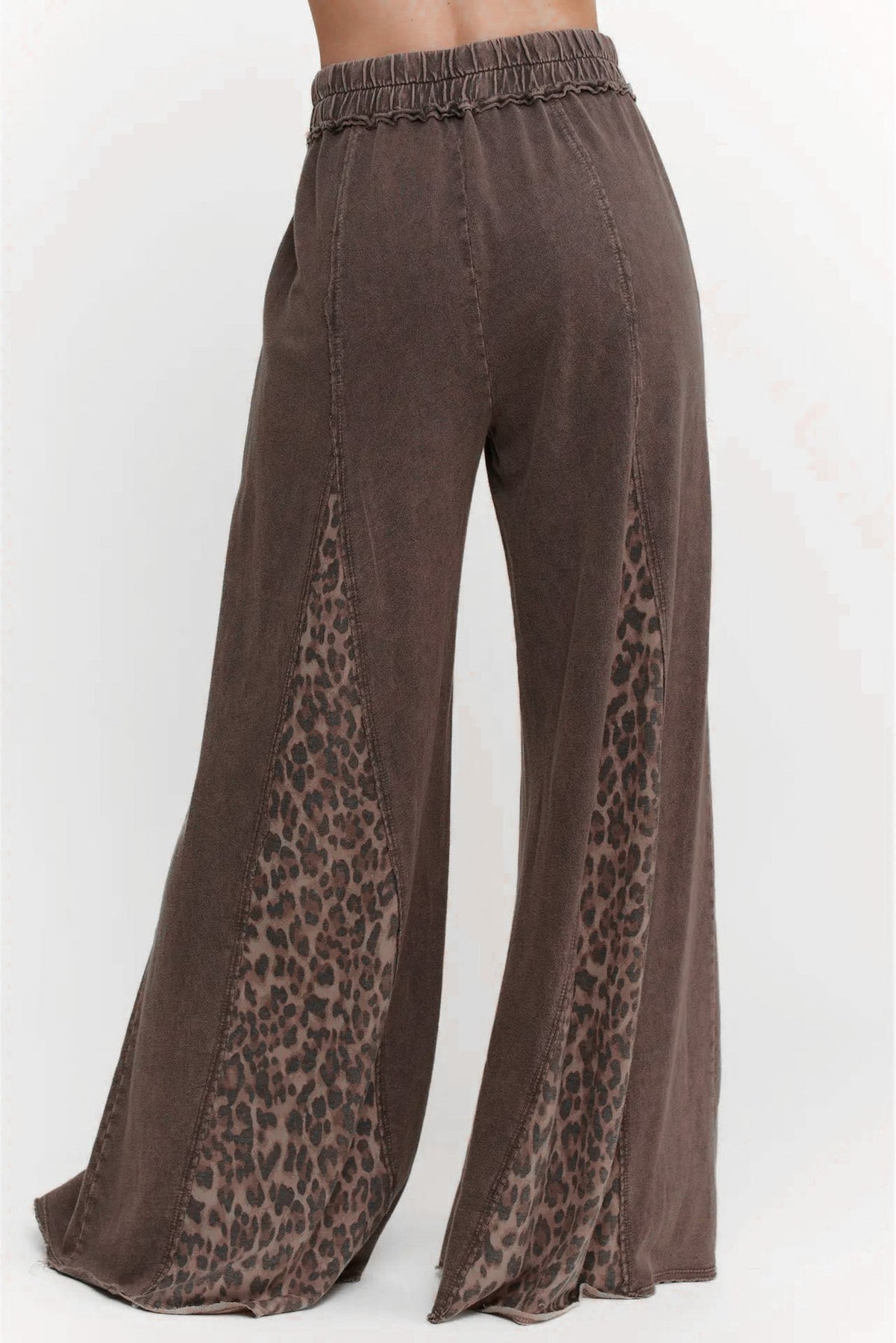 Say hello to cute and comfort in these NEW leopard print brown wide flare pants in a mineral wash! Featuring your favorite elastic waistband and comfy knit cotton!