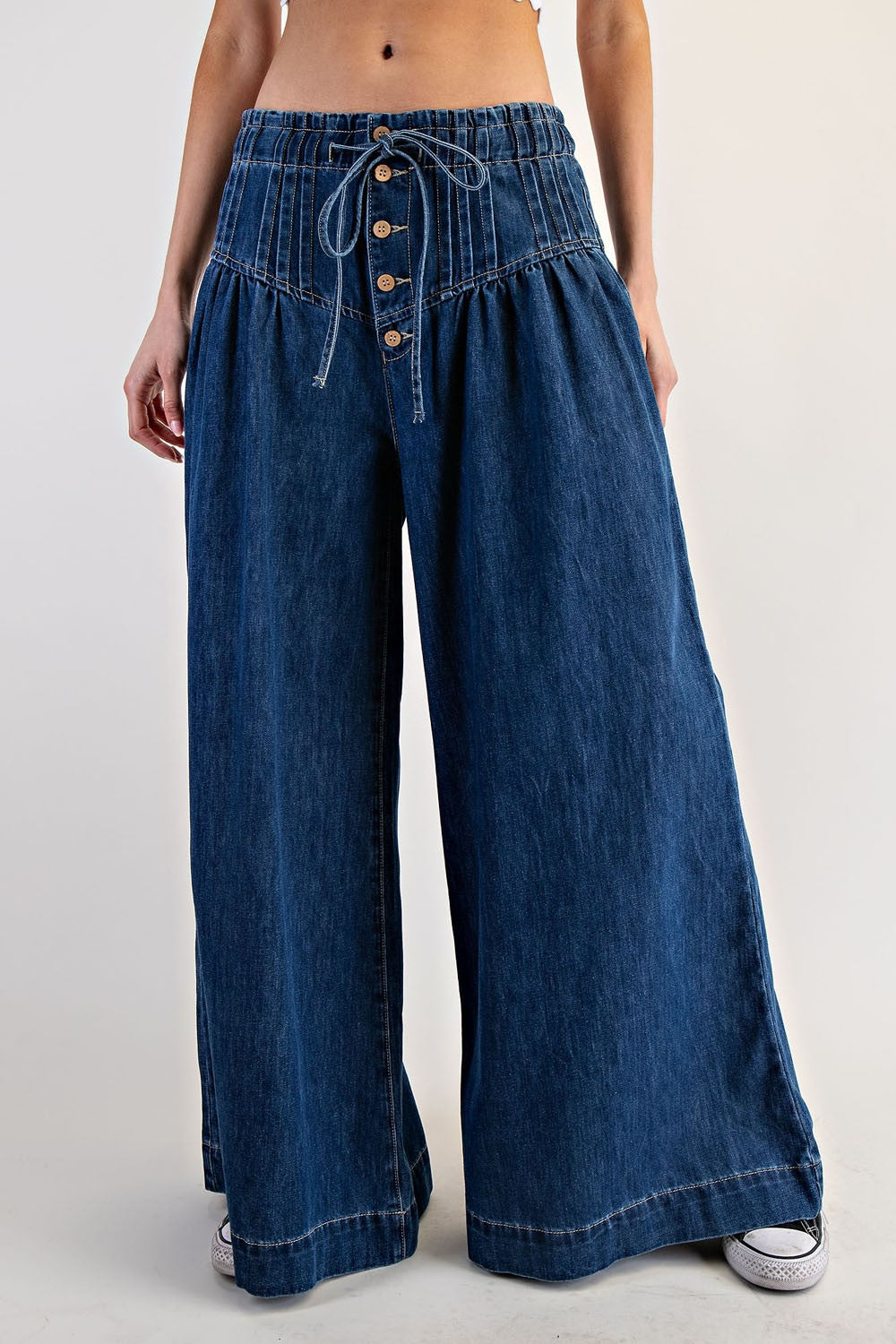 Get ready to add some fun and flair to your wardrobe with our Palazzo Perfect Blue Denim Pants! Featuring an elastic waistband with drawstring, a trendy button fly closure, playful pleated details on the waist front and back, and exaggerated wide legs. Perfect for adding a unique touch to any day out!