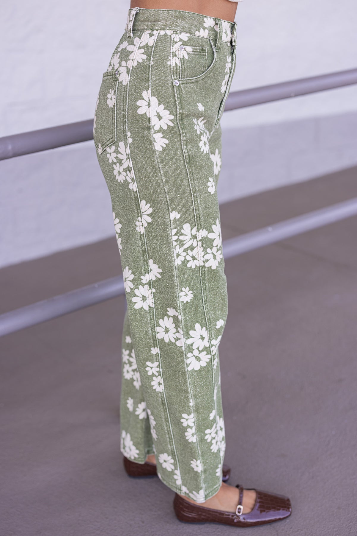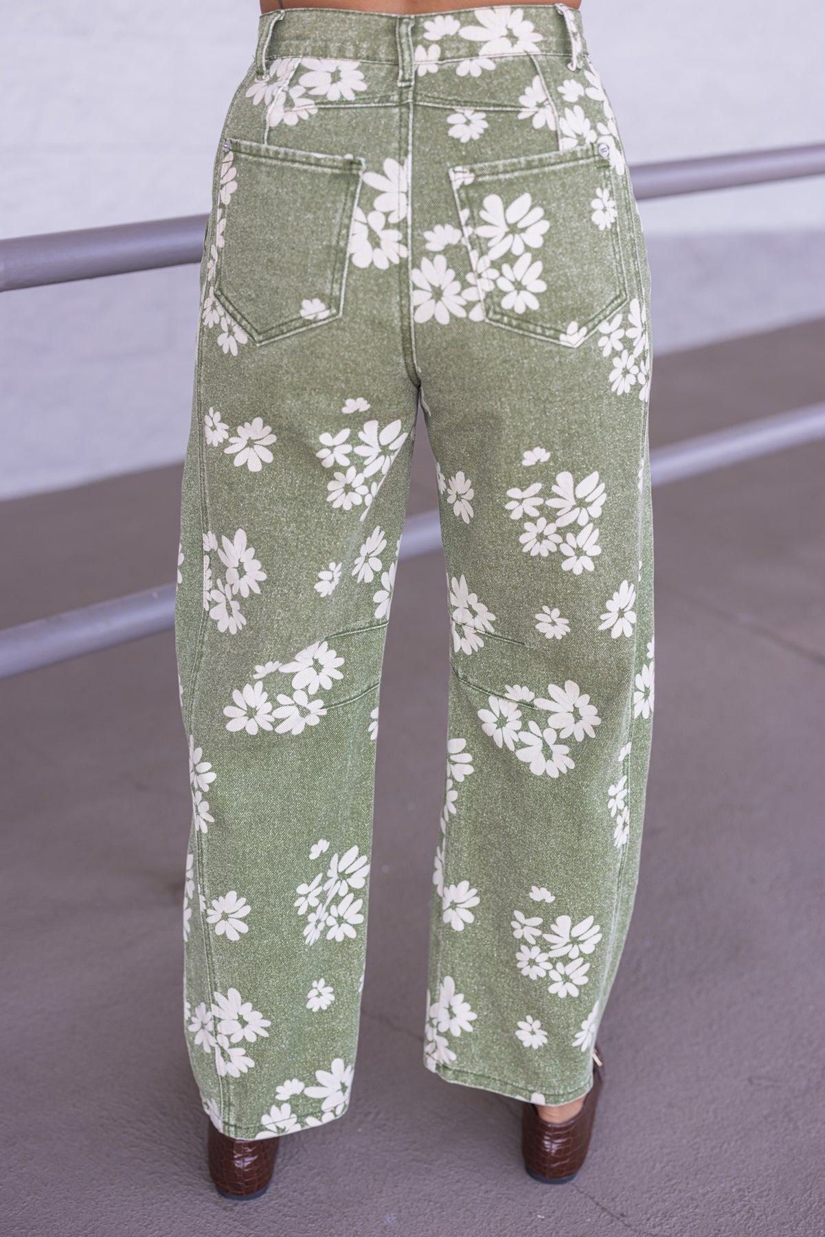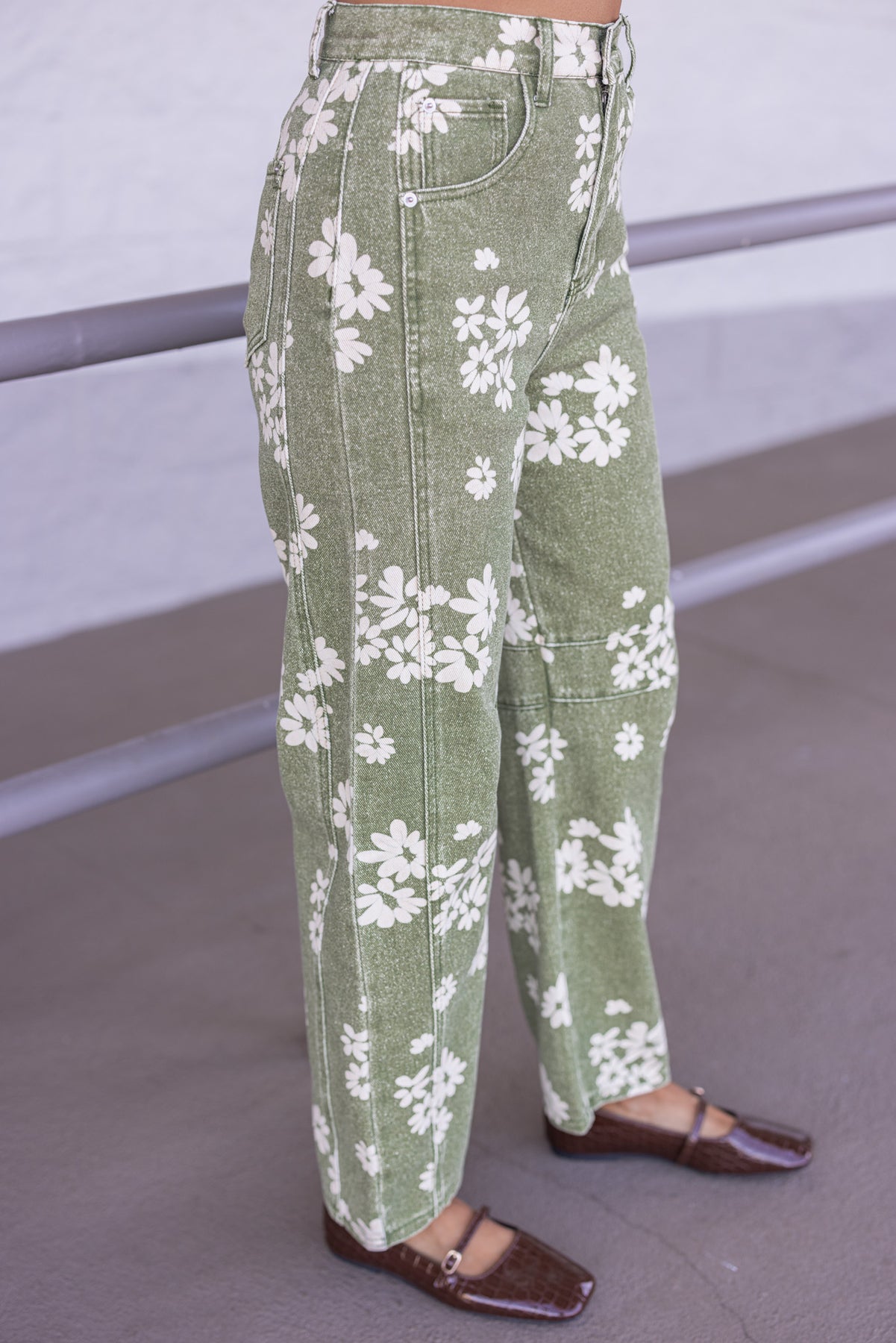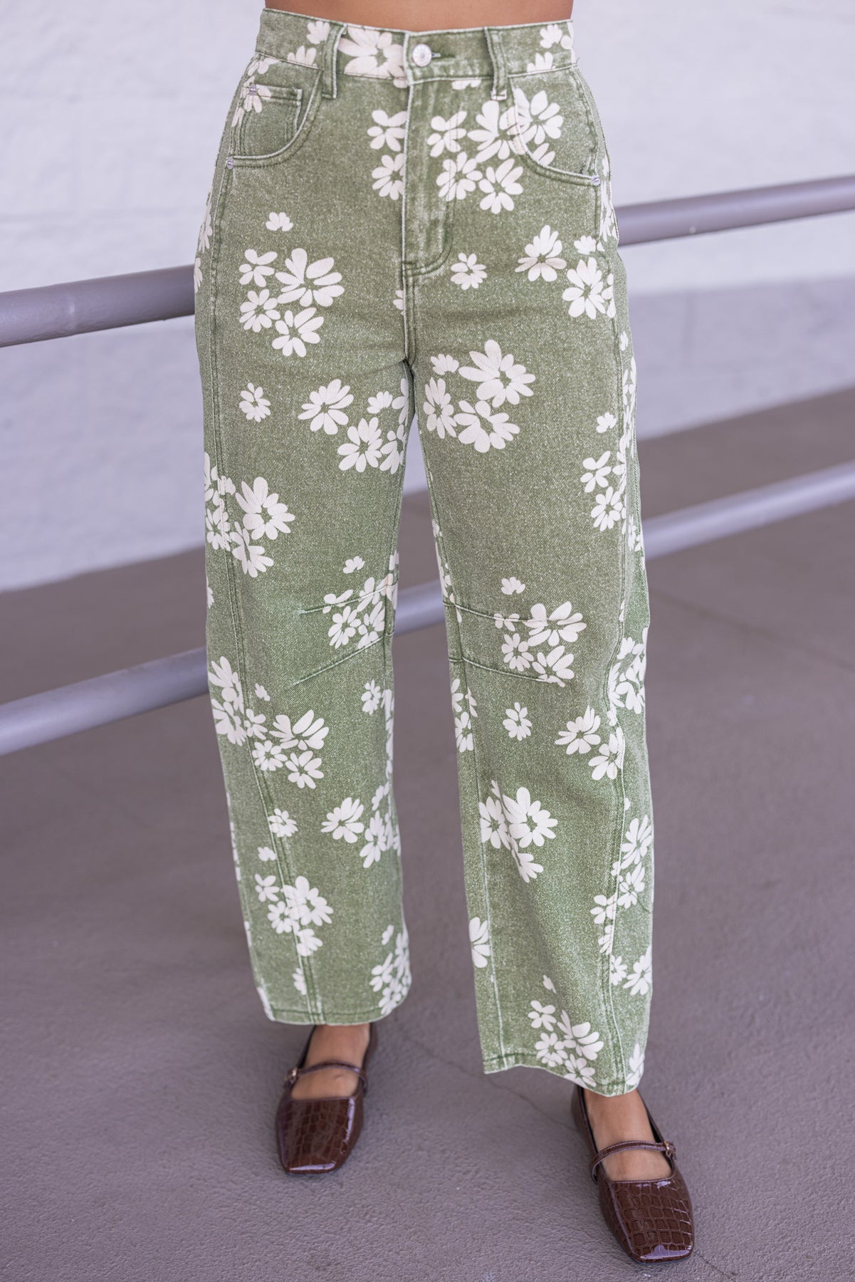 Embrace trendy fashion with these Twill Florals Olive Barrell Pants! Featuring washed olive twill fabric with cream floral print throughout. The button and zipper fly ensure easy wear, while the five pocket style adds a classic touch. Wide barrell legs create a fun, breezy silhouette that's perfect for playful days and relaxed adventures! Shop the look: Sweater Top | Brown Flats