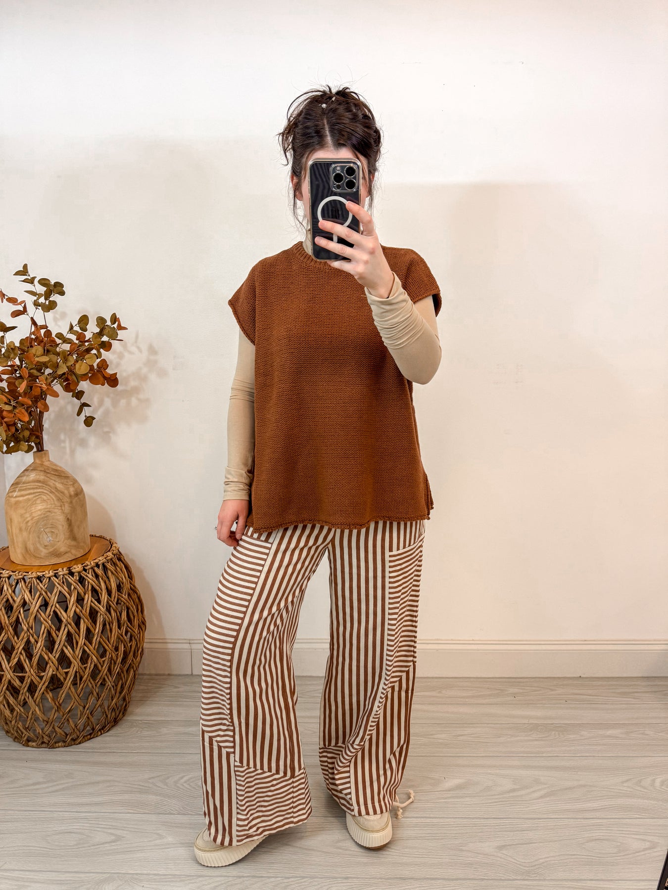 The jogger trend but make it extra CUTE! Check out these wide leg joggers, featuring pecan and cream multi patterned stripes. With an elastic waistband and drawstring, front pockets, and adjustable cinch ankles you'll be ready to stand out in style. Wear as joggers or a loose wide leg by adjusting the bottom ankle ties! Shop the look: Layering Top | Sweater Top