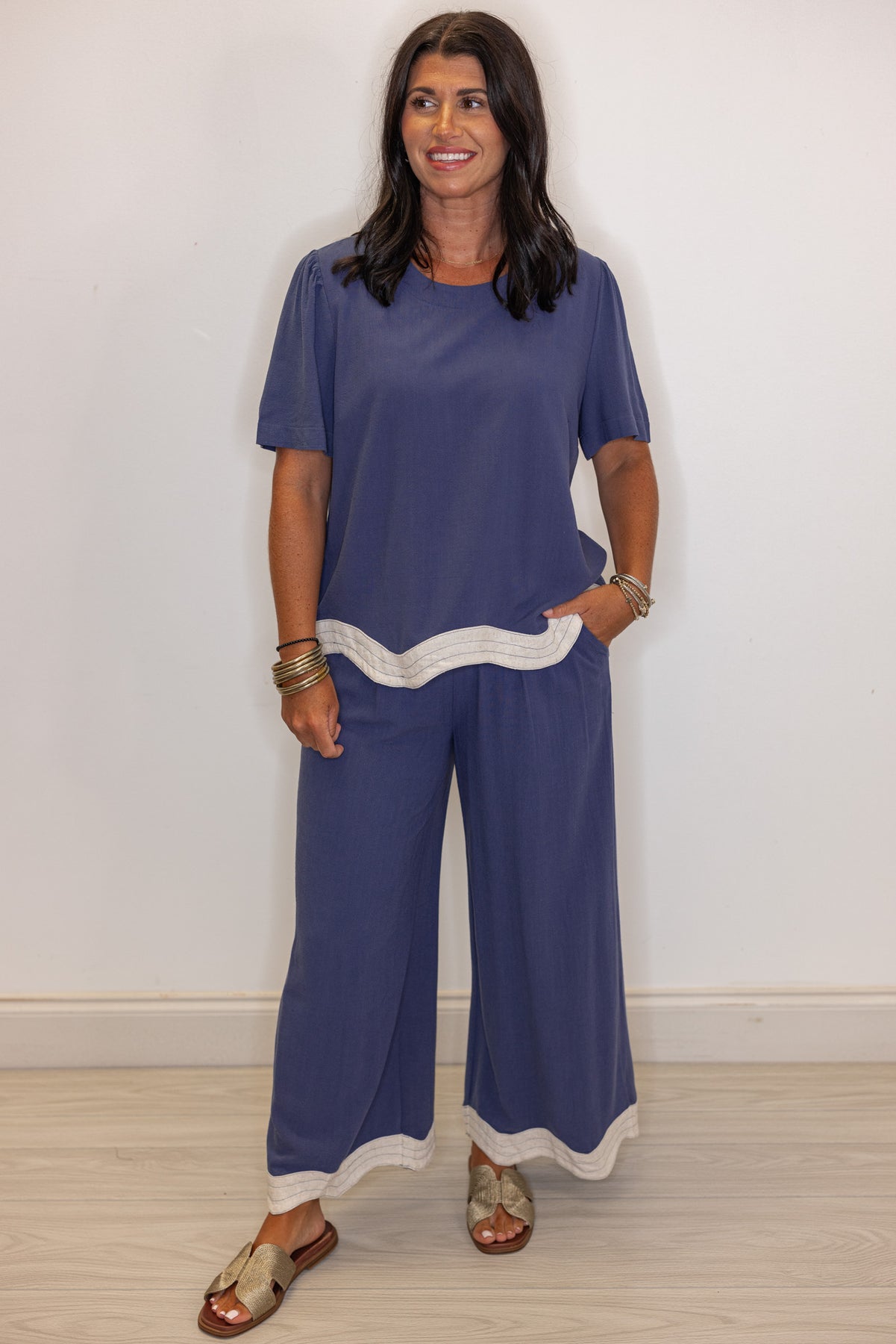 Wake up to Dreamy Perfection, the adorable top your closet NEEDS! Featuring medium blue "denim" color linen fabric, with short sleeves, and an oatmeal scalloped bottom hem. Perfect for adding a touch of charm to any day out! Shop the matching pants here for a super cute and trendy outfit!
