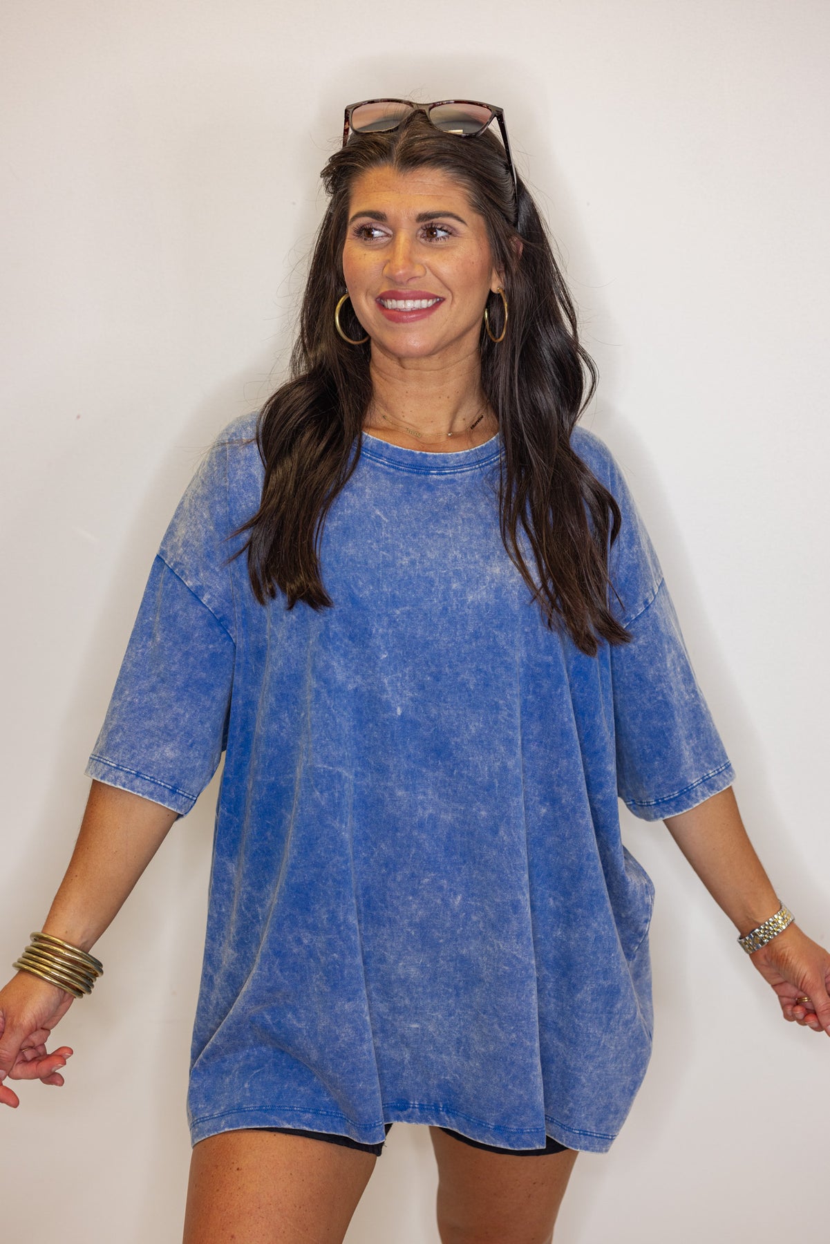 Looking for the perfect oversized tee that's both comfy and stylish? This Washed Blue Boyfriend Tee has you covered! With a light acid washed finish, round neck, and drop shoulder design, this shirt is both trendy and relaxed. This top is perfect to pair with denim shorts and bikers this summer. Perfect for any casual occasion, you'll be living in this tee.