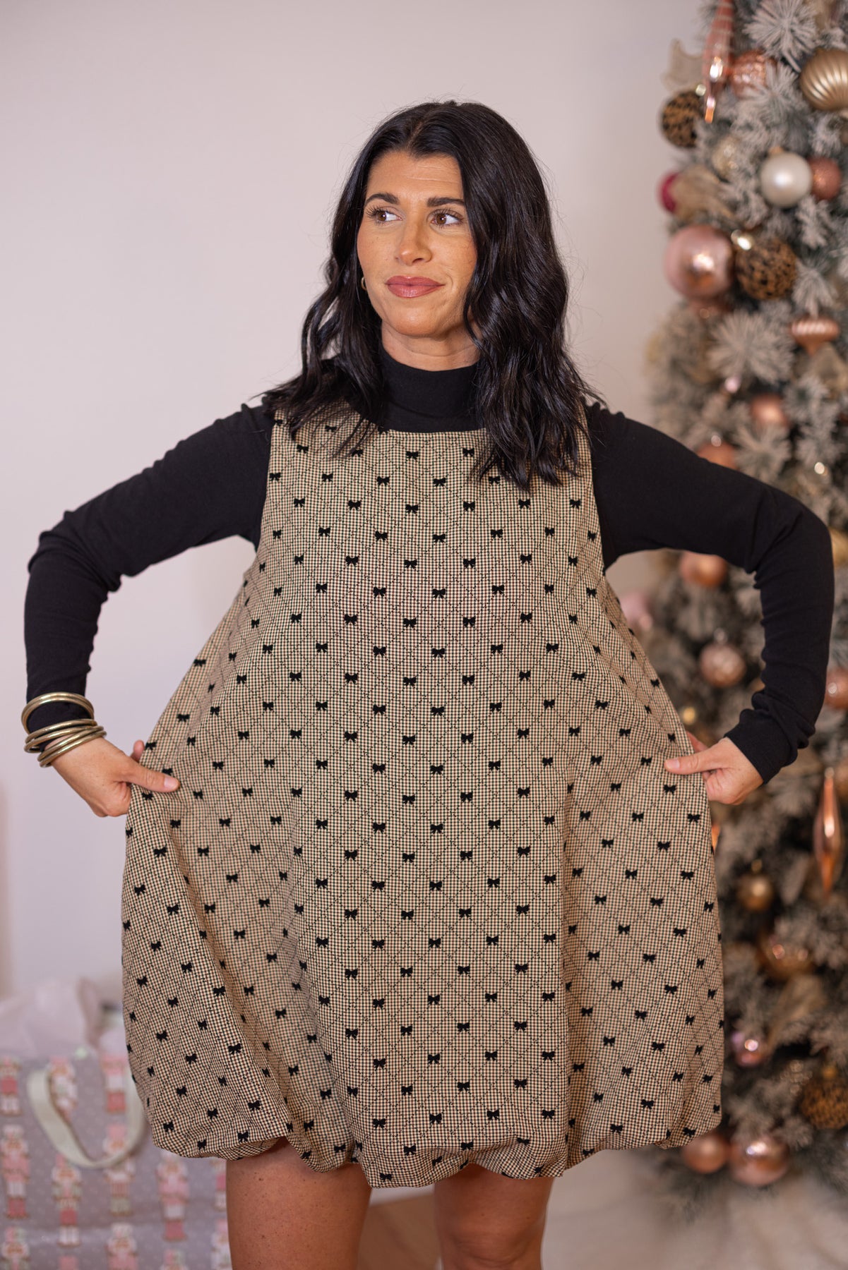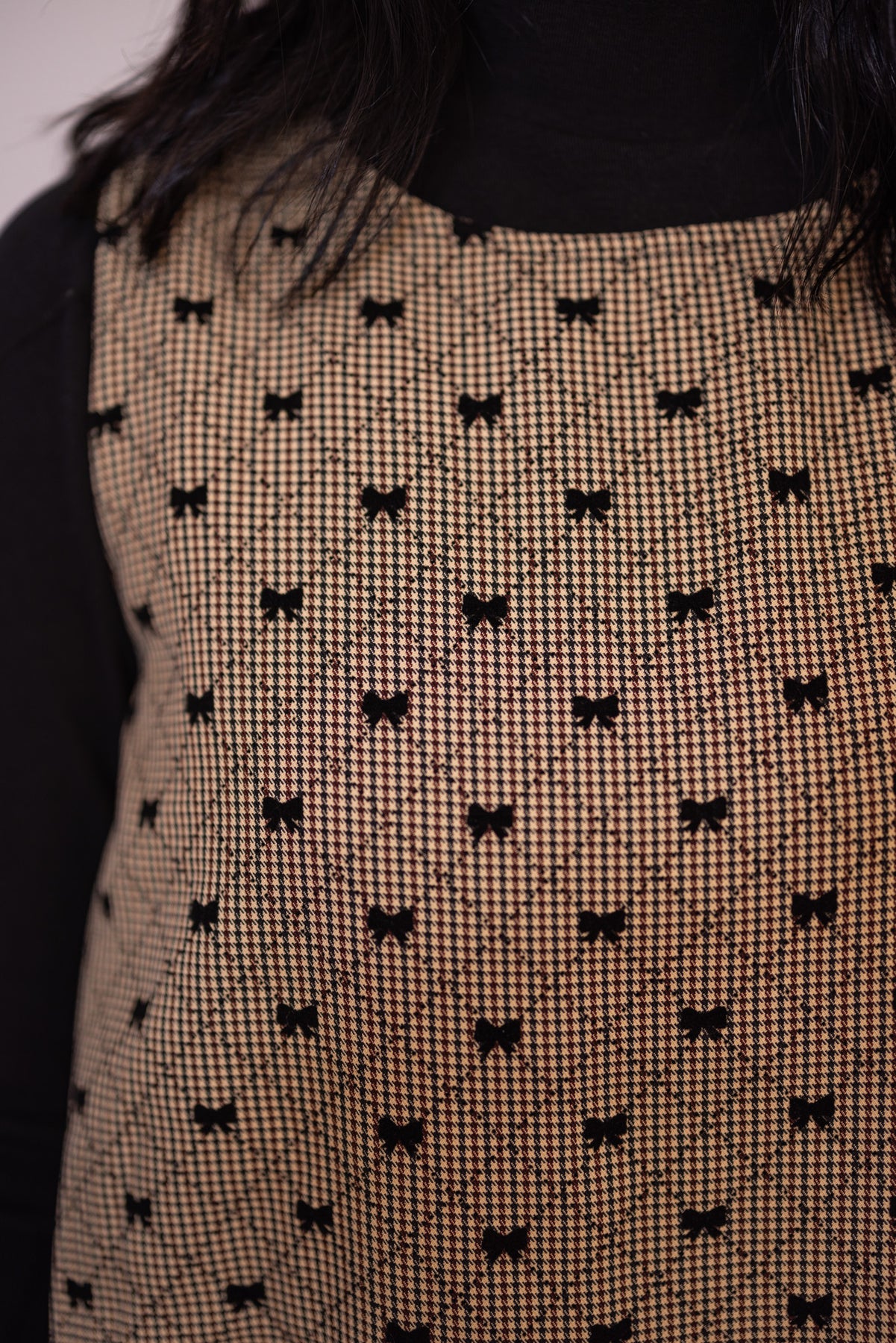 This charming gingham dress brings vintage-inspired flair with a modern twist. Featuring a classic brown, taupe, and black gingham pattern, it's accented with an adorable velvet bow tie checkered detail that adds instant personality. The sleeveless silhouette keeps things breezy and versatile, while the playful bubble hem creates movement and dimension. Perfect for dressing up or down, this dress is a delightful addition to any wardrobe that celebrates timeless style with a touch of whimsy!