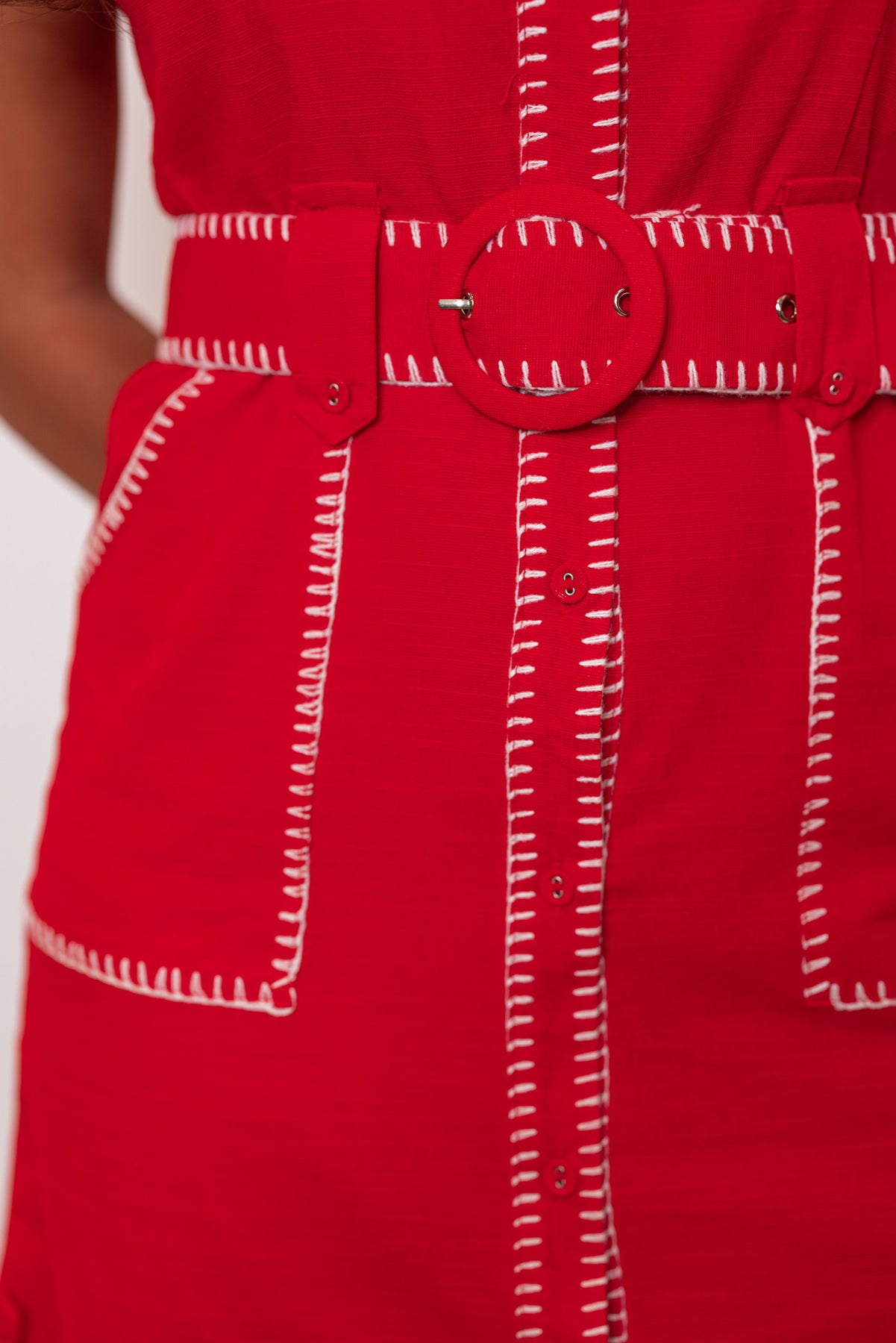 Twirl into style with this sassy red dress that's all about the details! Cream stitching dances throughout the red fabric, while the sleeveless cut keeps you cool for summer fun. With a button down front, belted waist, and front pockets, The Perfect Stitch Red Dress isn't just perfect — she's your new go-to for looking fabulous without even trying!