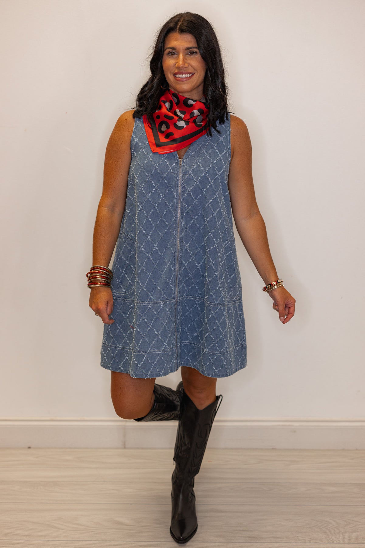 Slip into our Riverside Stroll Blue Denim Dress for instant cool-girl vibes! This playful sleeveless number features an eye-catching frayed diamond print, and white stitching that pops against the blue denim. With a zipper front closure and front pockets, it's your new go-to for casual wear or dress it up for a night out! Would look darling layered with a lace top underneath, too! Shop several different styles of layering tops HERE!