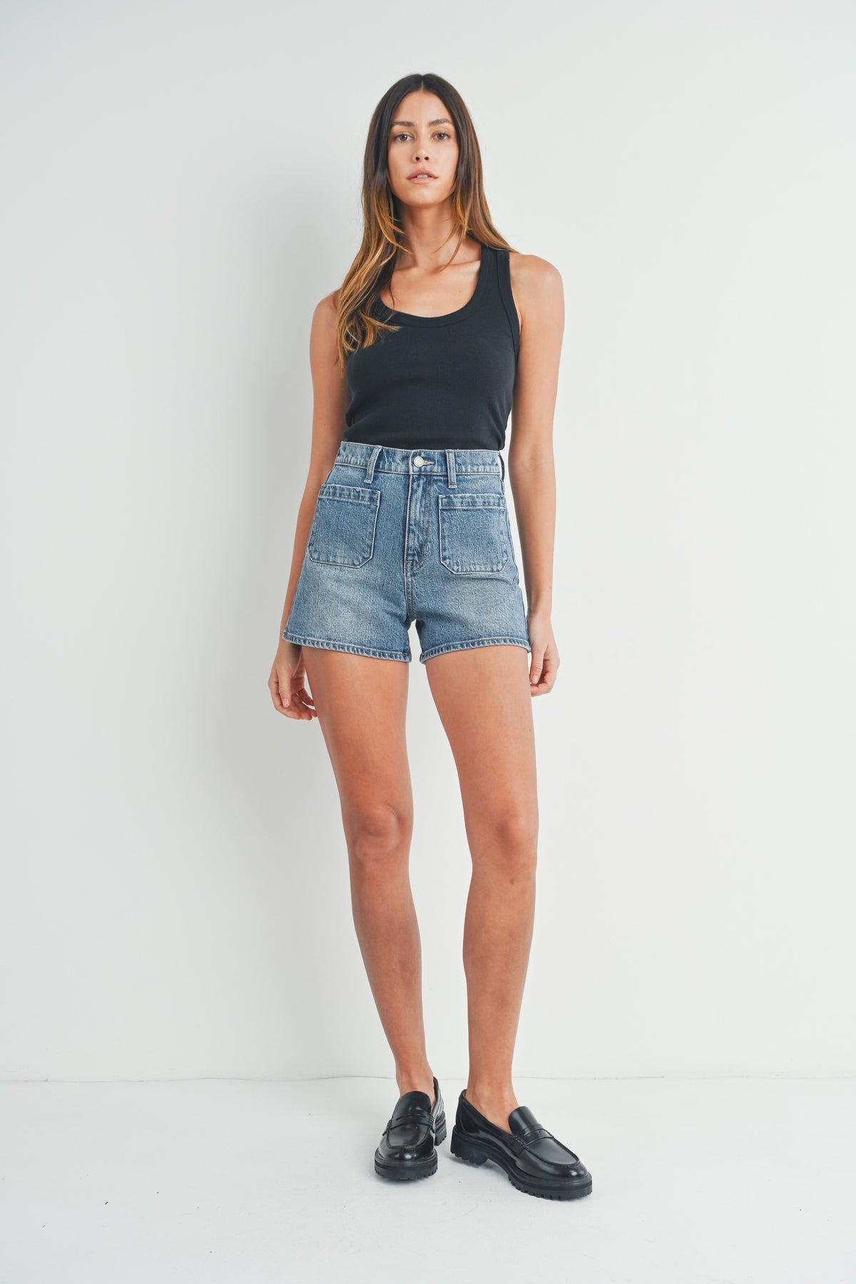 Introducing the Just Black Denim High Rise Shorts in Medium Wash! We love high waisted shorts to get that tummy control and a perfectly stretchy fabric, making them oh-so-comfortable.