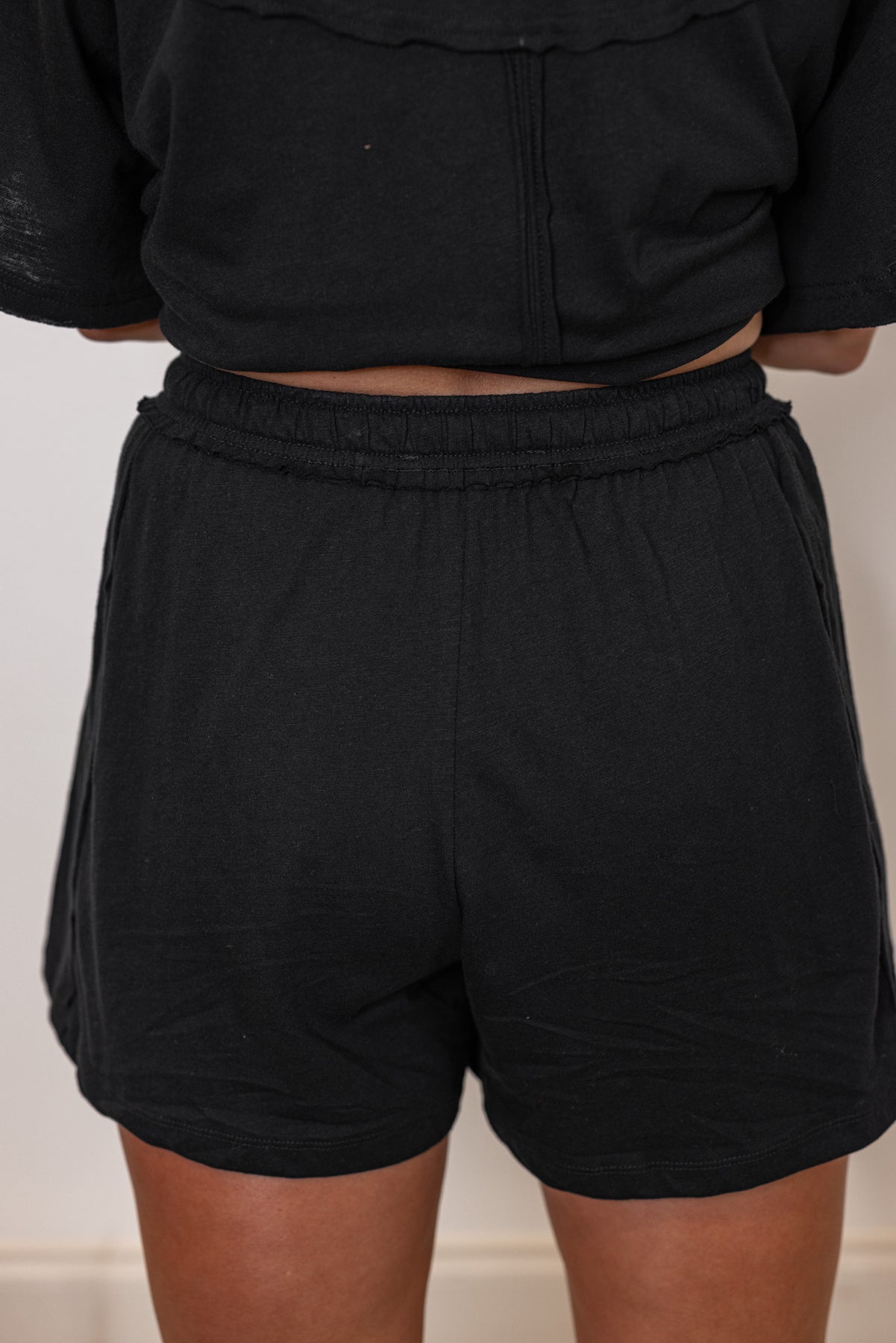 Black cotton slub knit shorts and top set by Rae Mode showing tops relaxed fit