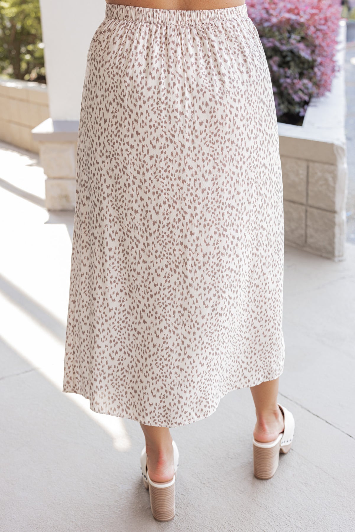 Embrace your wild side in our Safari Stroll Cream Midi Skirt! Featuring cream and mocha animal print fabric with an elastic waistband in back and a smooth waistband in front. Show up, and stand out! Shop the look: Sweater Top