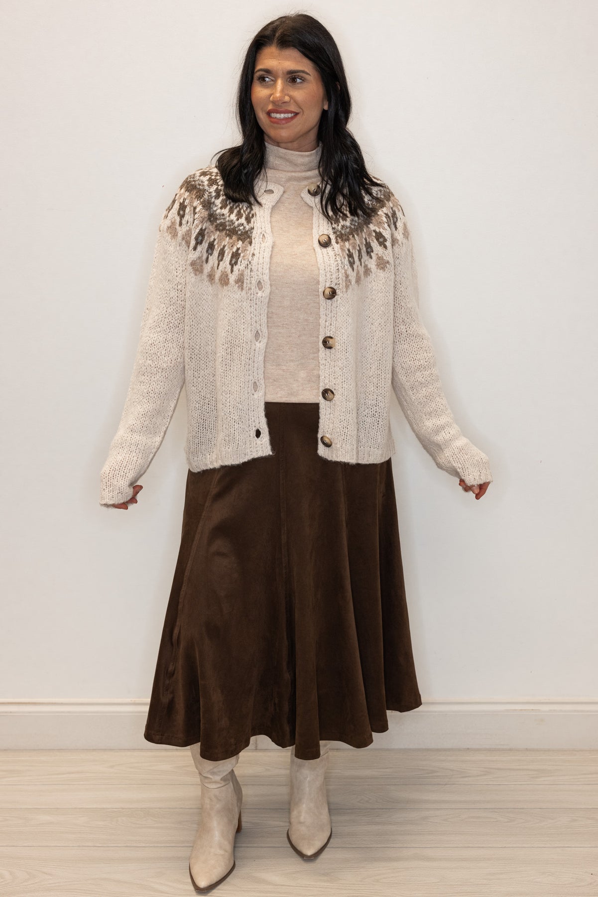 Step into classic style with the Suede Perfection Espresso Midi Skirt! Crafted from espresso brown faux suede fabric, this skirt features a hidden hook and eye zipper closure in back for a tailored look. The flared hem adds a playful twist to this dramatic, timeless midi. Perfect for days when you want to stand out and feel flawless! Shop the look: Cardigan Top