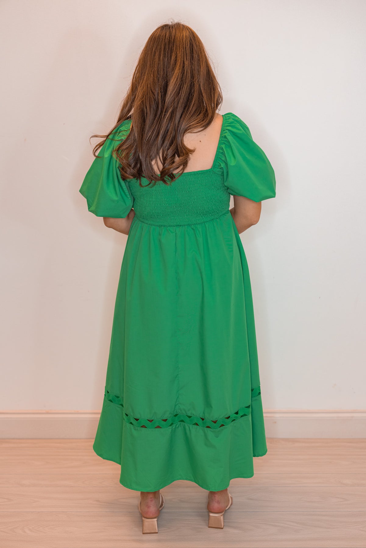 Get ready to prance around in our Spring Fancy Green Midi Dress! Made from a lovely green fabric that's sure to turn heads, this dress features exaggerated ric rac trim throughout, a cute square neckline, and peek-a-boo details. With playful puff sleeves, you'll feel fun, flirty, and fab in this dress - whether heading to a special event, or to a casual outing!