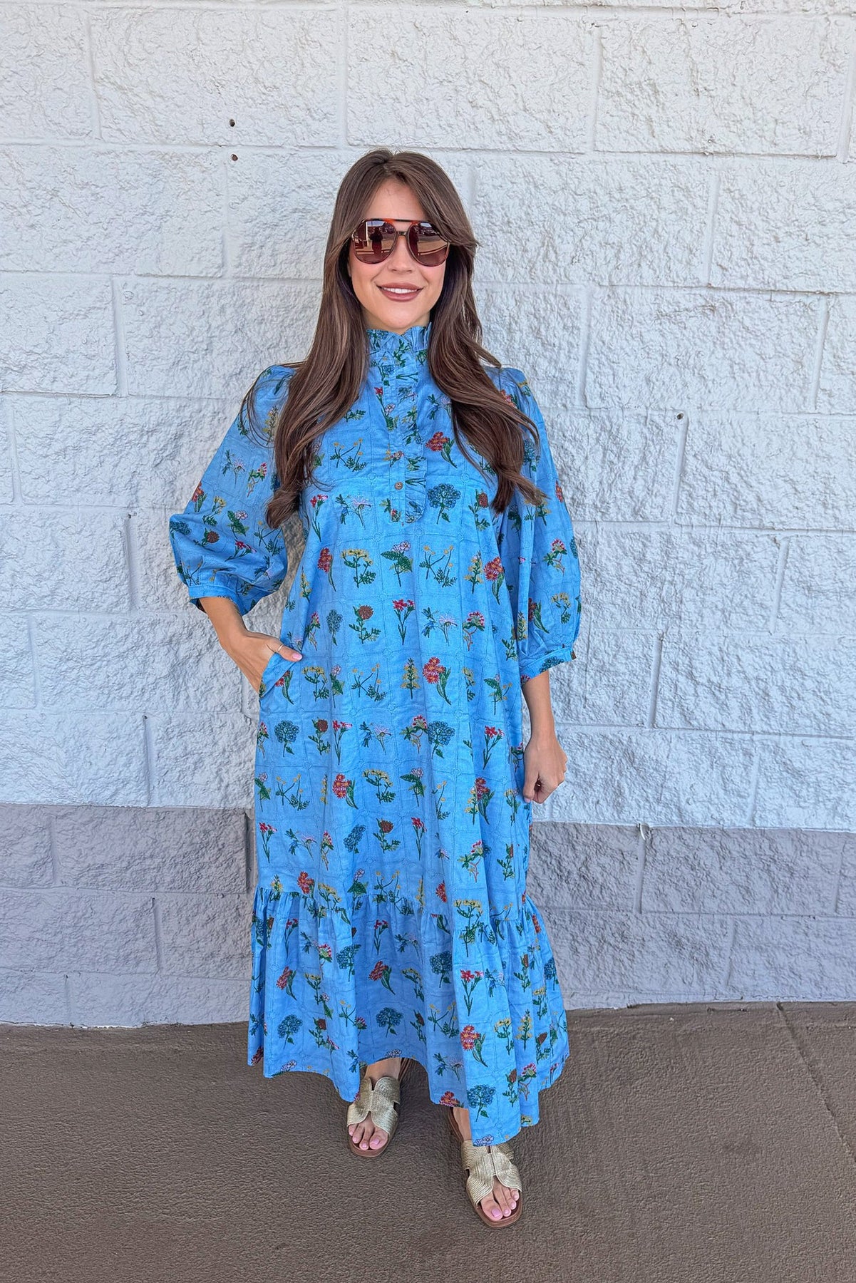 This playful blue dress features a lovely multicolor floral panel print fabric that gives the appearance of florals on chambray. So pretty! The button front bodice and mock neck are framed by a ruffled trim, while balloon sleeves and a belted waist create a charming silhouette. Perfect for sunny days and special occasions!