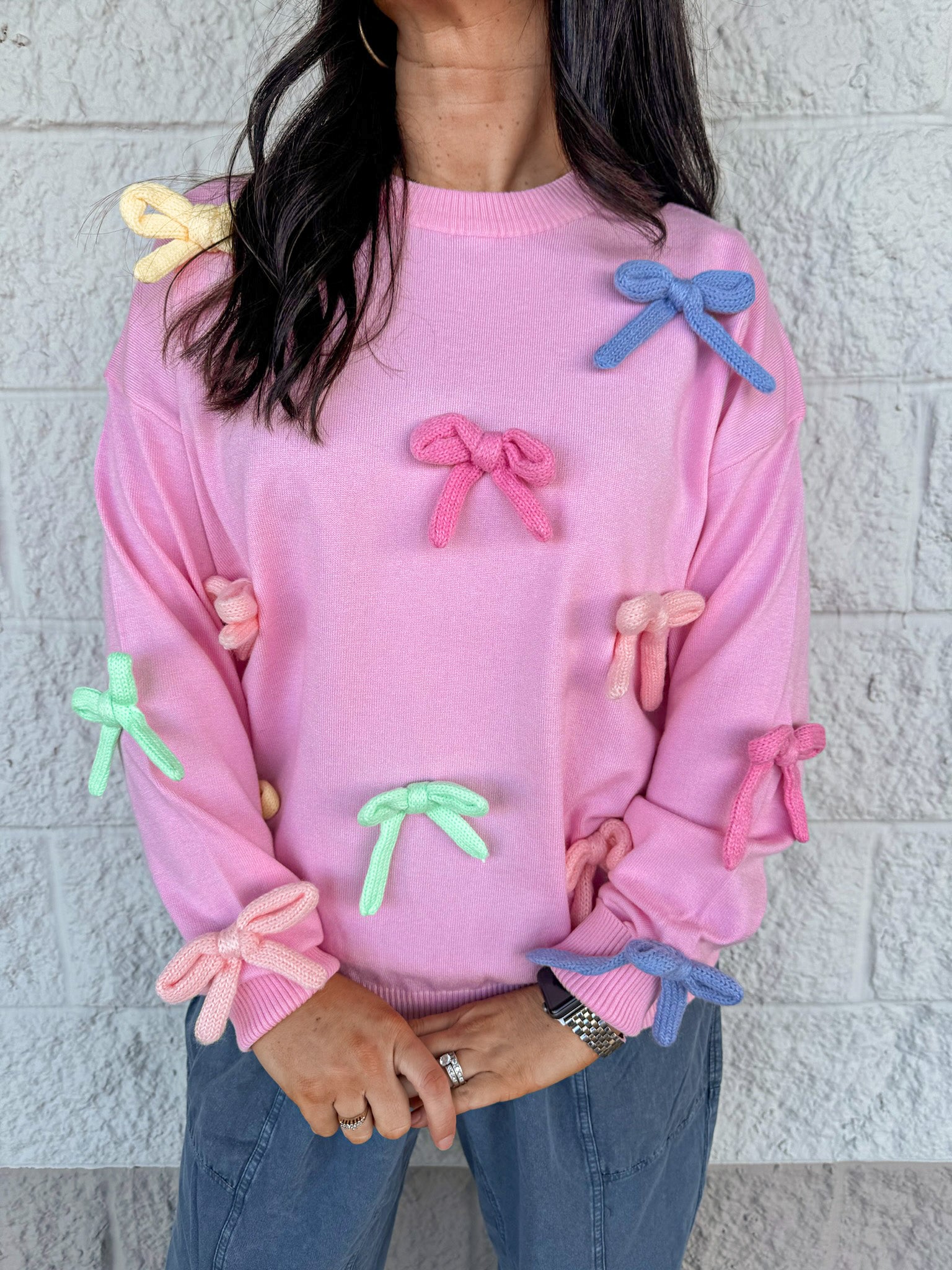 Add a delightful touch to your wardrobe with our Bow Tied Delight sweater. The pretty light pink knit fabric gives a playful feel, while the long sleeves and crew neckline add snugly comfort. But the real star is the front, decorated with adorable multicolor 3D bow ties. Shop the look: Pants