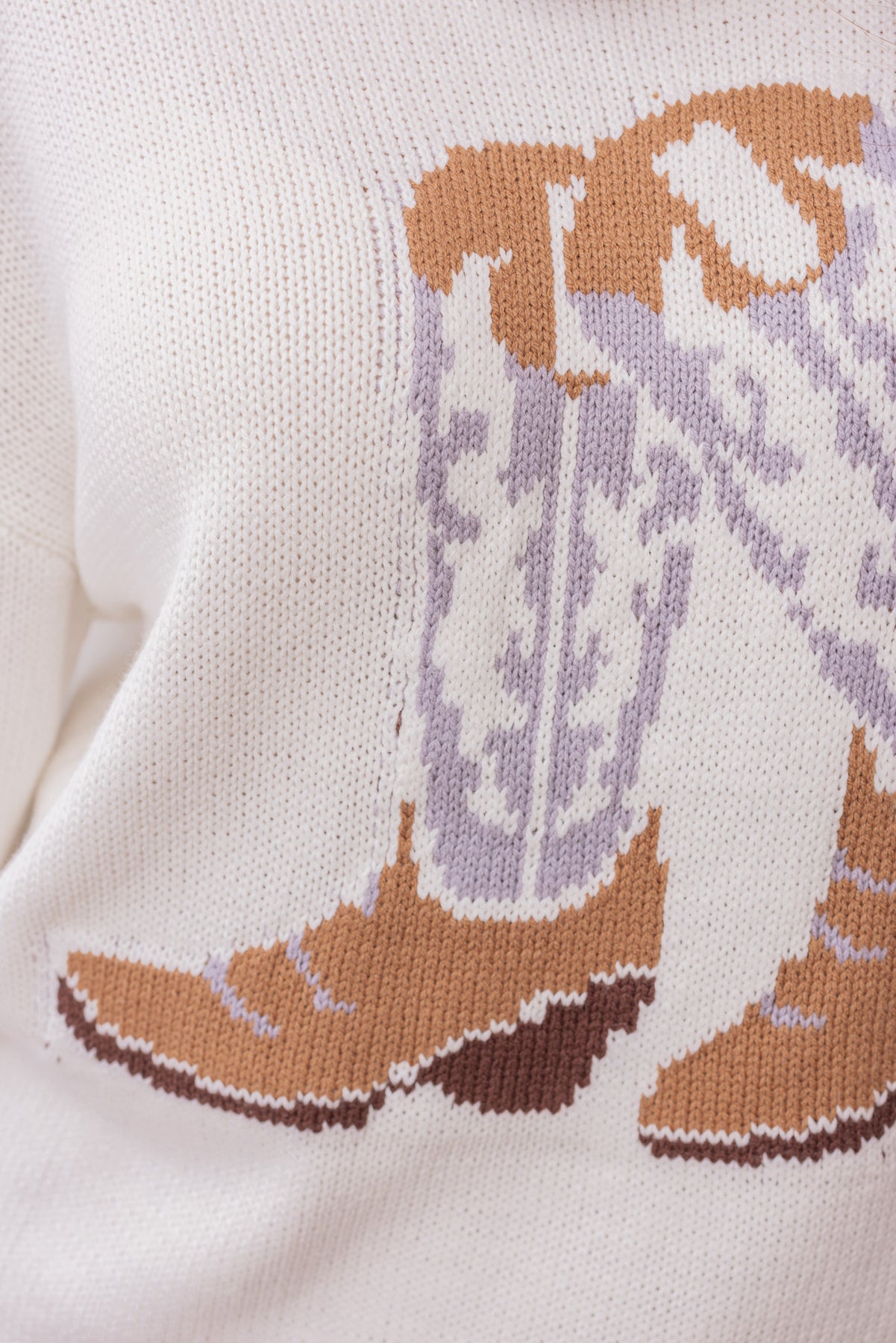 Women's ivory sweater with brown and grey cowboy boots on the front