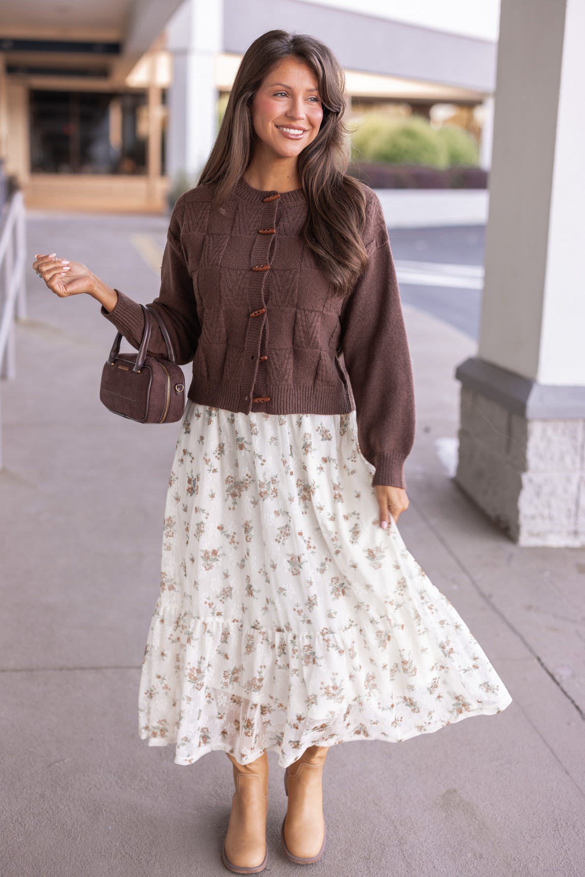Cozy up and get comfy in the Monochrome Checkered Brown Sweater Cardigan! Featuring a button front closure with wooden decorative buttons, a crew neckline, long sleeves, and a textured knit monochrome checkered pattern in front. The cropped design adds a playful twist to this lovely babe. Perfect worn buttoned up as a classic sweater, or left open as a trendy cardigan! Shop the look: Boho Floral Midi Dress
