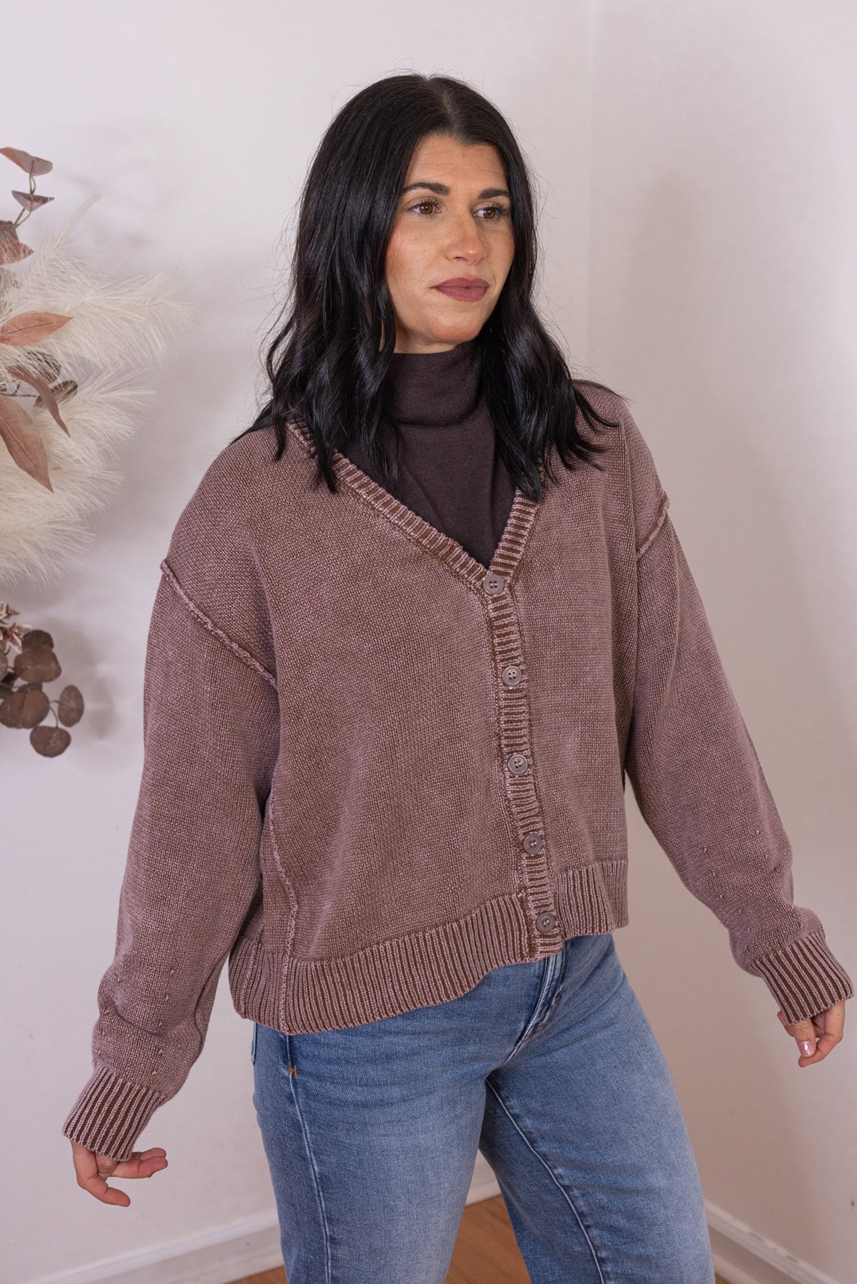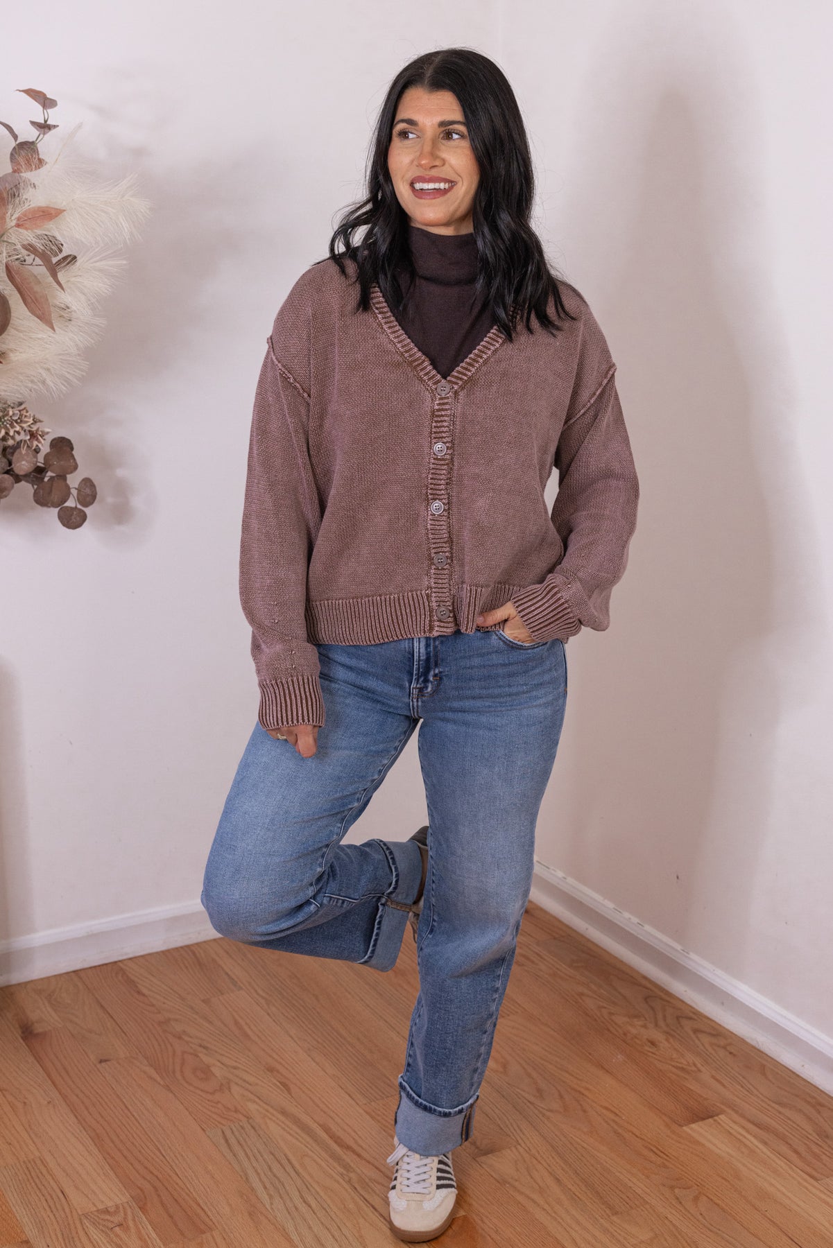 Throw on this washed mocha cardigan and instantly level up your vintage vibes! The button front closure makes layering effortless, while the flattering v neckline keeps things chic and timeless. Ribbed trim details add just the right amount of texture and polish. Perfect for those days when you want to look put-together without trying too hard - because sass is always in style!