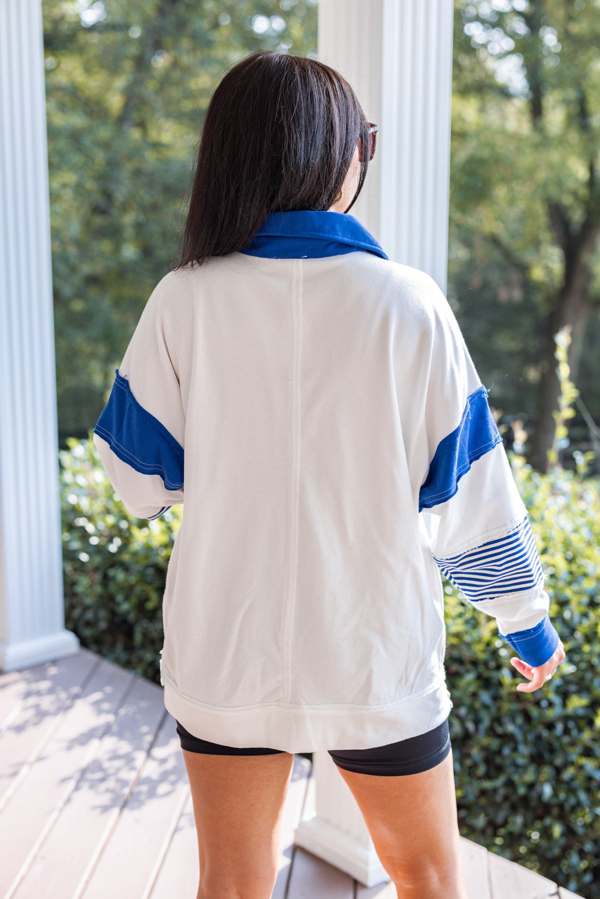 Cozy up in style with this Blue Colorblock Off White Pullover! The off white and blue striped colorblock fabric is french terry knit and features a v cut neckline with collar, and cuffed long balloon sleeves. Reverse seam details add a touch of unexpected charm - making this pullover perfect for all your casual trending needs!