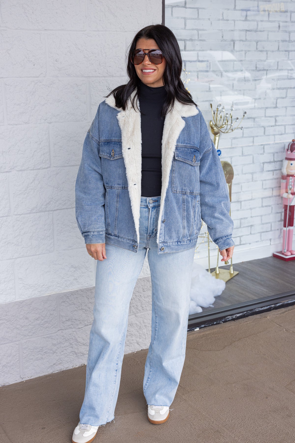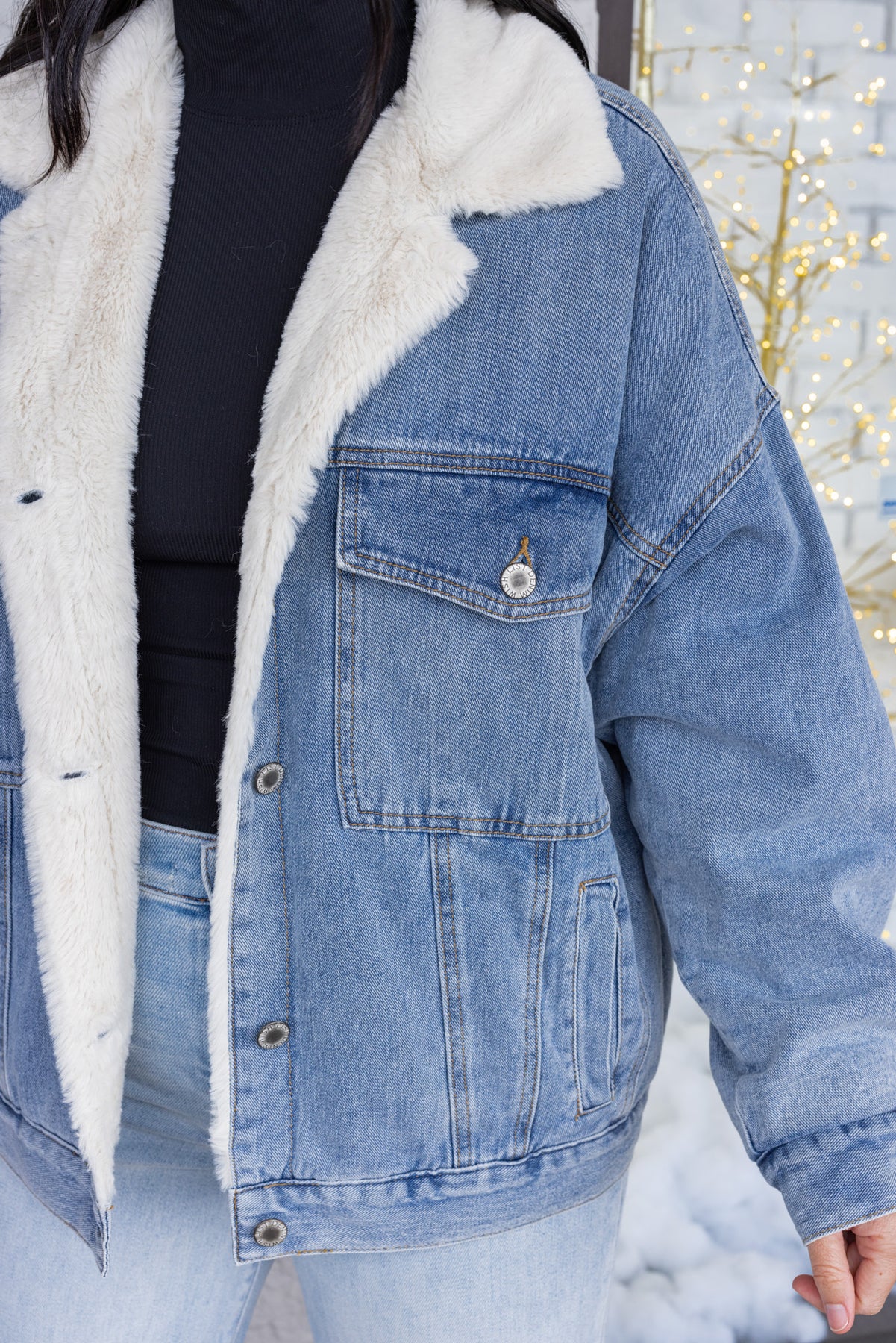Feel all the trendy fur vibes in our Denim And Fur jacket! This blue denim babe has a button down front closure with a collar, 2 button closed chest pockets, 2 side pockets, and is fully lined with plush cream faux fur. Perfect for the upcoming seasons, she's sure to make a statement while keeping you warm and toasty!
