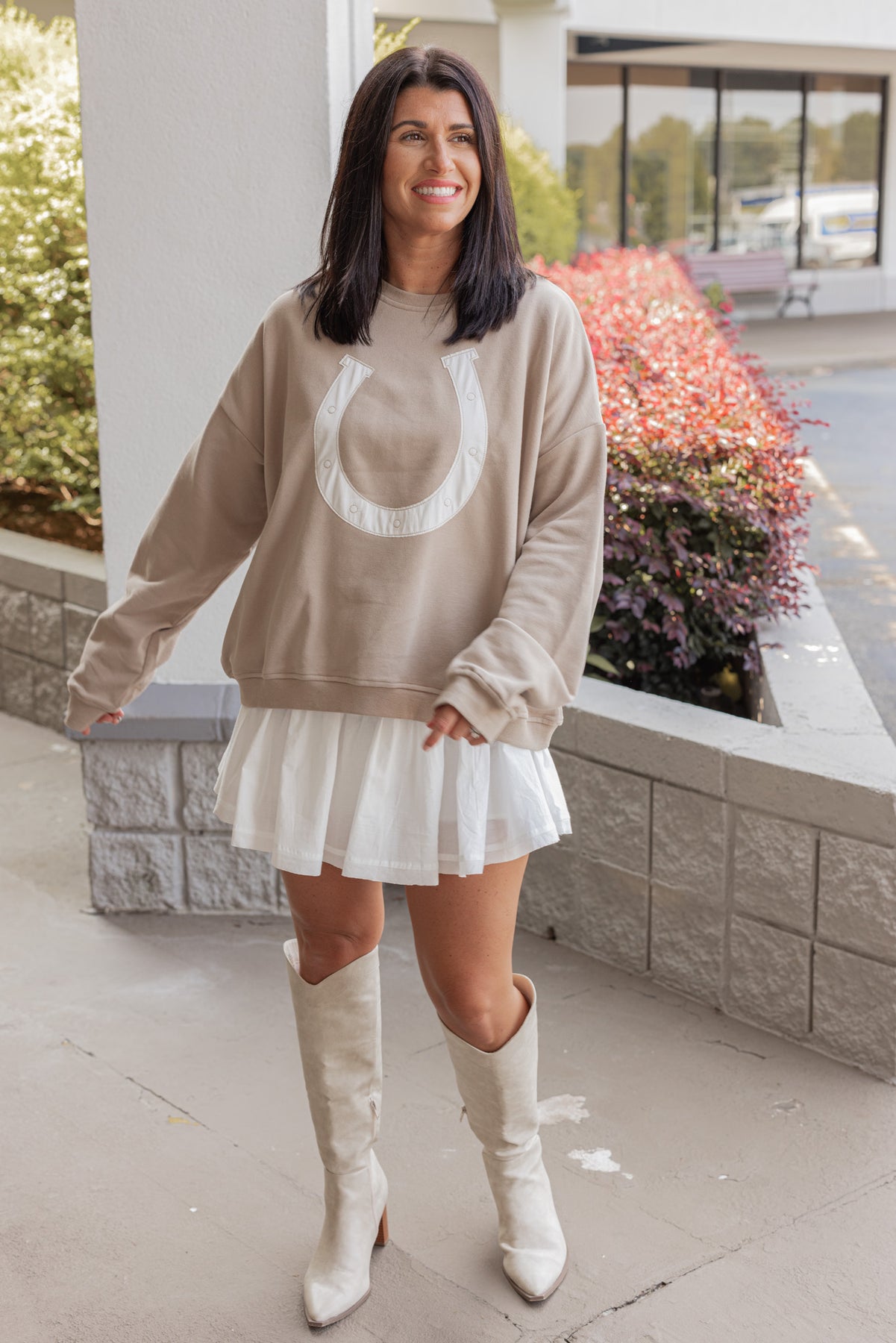 Experience understated elegance with the Western Luck Taupe Horseshoe Sweatshirt! Crafted from soft French terry knit, its relaxed fit ensures comfort throughout your day. The large white horseshoe stitched on the front adds a fun Western inspired detail, while the classic crew neckline and long sleeves make it a versatile piece perfect to style dressy or casual! We have it styled over a slip dress and LOVE IT this way!! Shop the look: Slip Dress | Boots