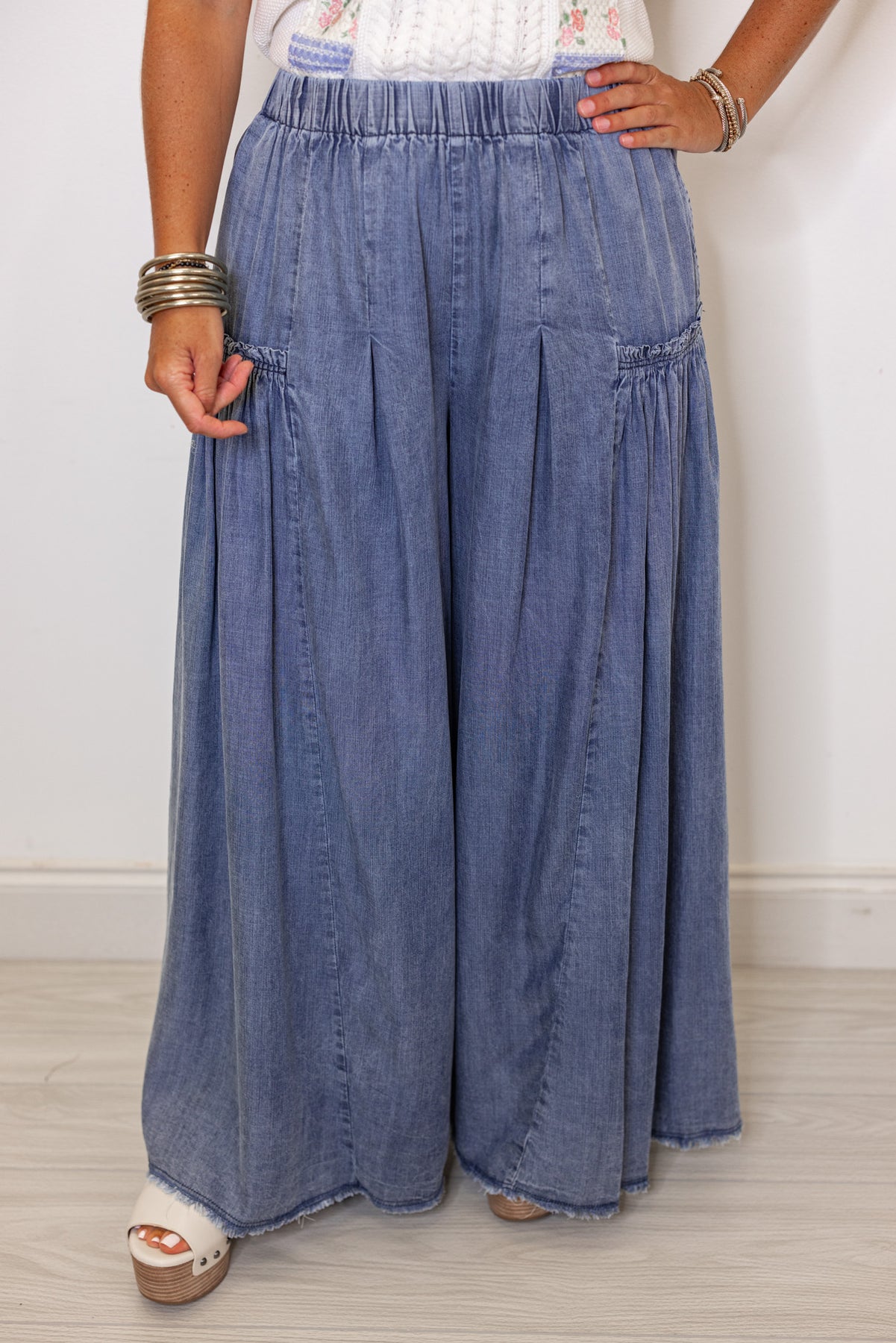 Get ready to add some fun and flair to your wardrobe with our Ansley Dark Chambray Palazzo Pants! Featuring an elastic waistband for ultimate comfort, as well as wide legs and playful ruffle detail on the sides. SO easy and comfy! Shop the look: Knit Top