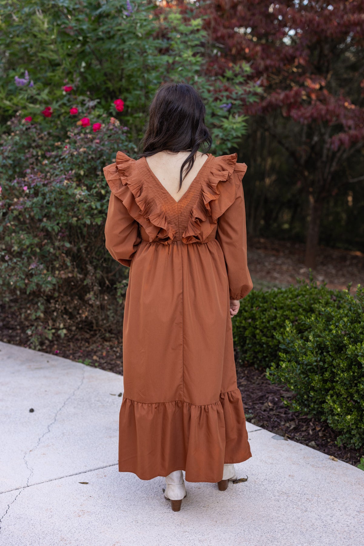 Embrace the joy of Autumn with our new fave midi - Autumn Chic! Featuring the prettiest dark caramel fabric, with a v neckline and ruffled v bodice in front and back with decorative stitching detail, and long balloon sleeves. You'll feel just like the bell of the Autumn ball! Perfect for all of those upcoming celebrations!