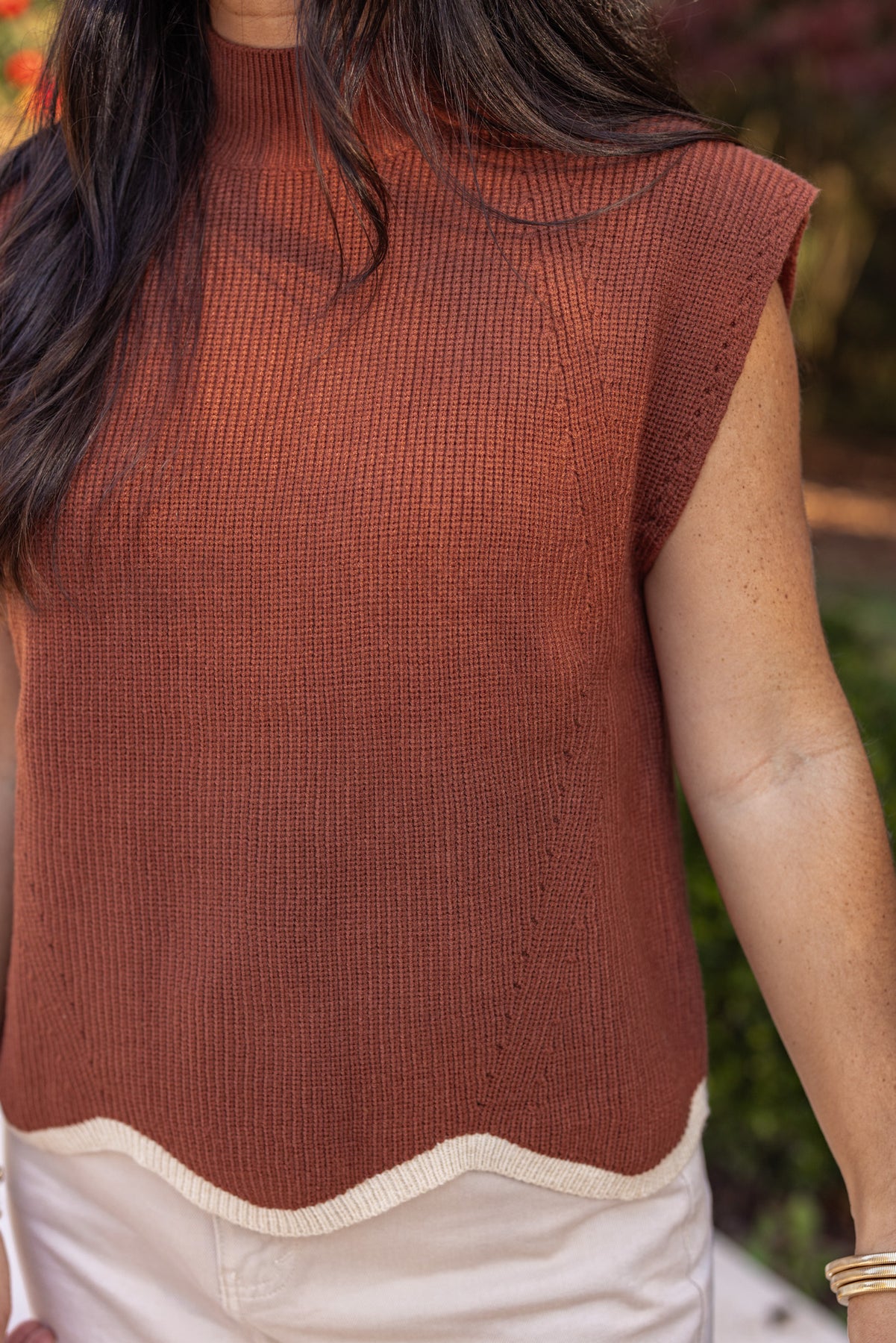 Elevate your wardrobe with our Autumn Glow brown ribbed sweater. Made from a soft ribbed knit, this Mock neck sweater features a unique short sleeve design and a scalloped bottom hem trimmed in cream. Perfect for making a stylish statement while staying oh so comfy! Shop the look: Skirt | Boots