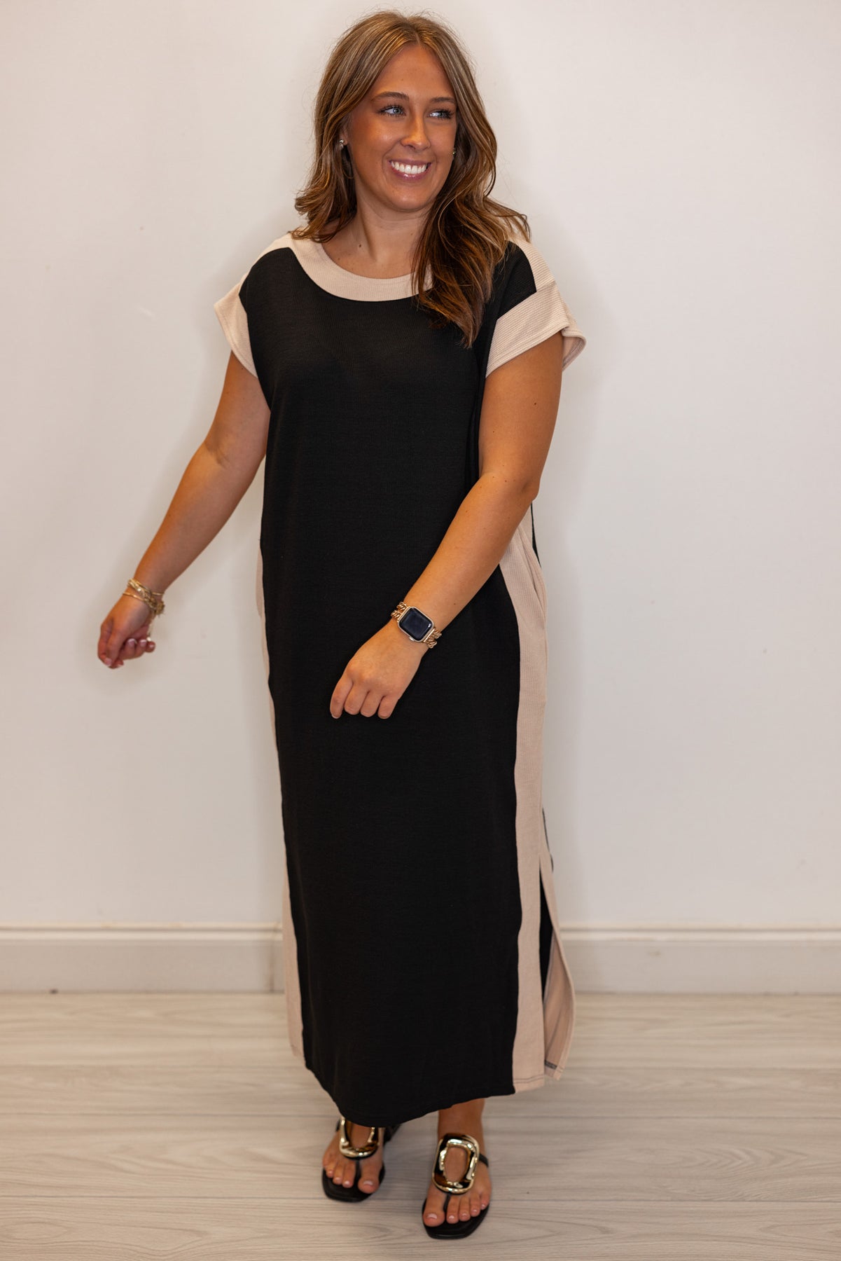 Get ready to turn heads this season with our Autumn Maxi Black Dress! This solid ribbed dress features cap sleeves and a round neck, with a midi length for a flattering fit. Contrasting solid trim adds an extra touch of sophistication. Perfect for any occasion.