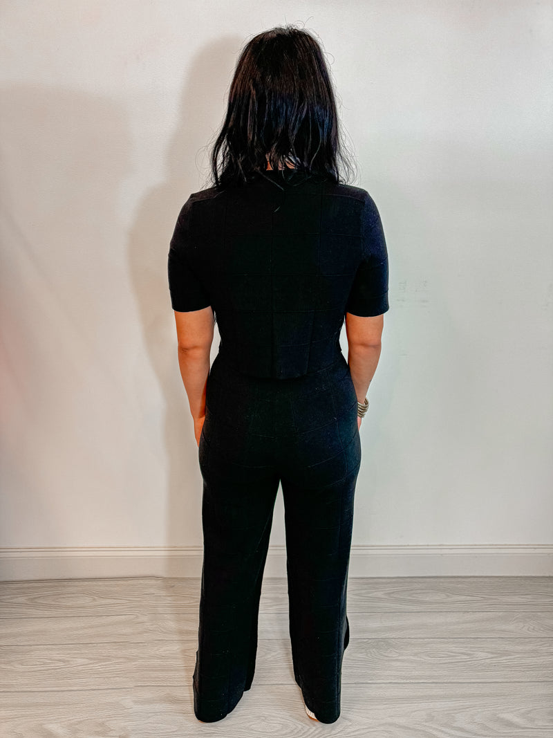 Black knit wide leg pants with square textured seam detailing