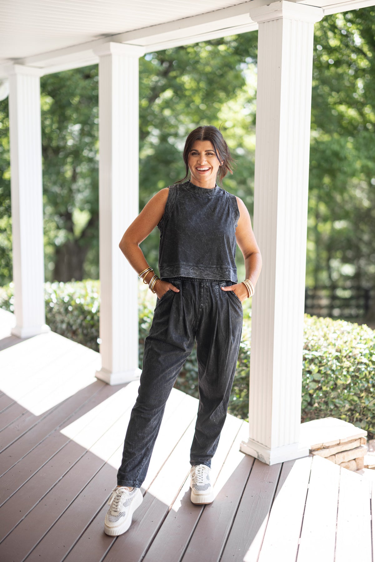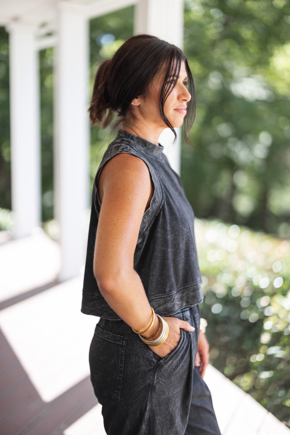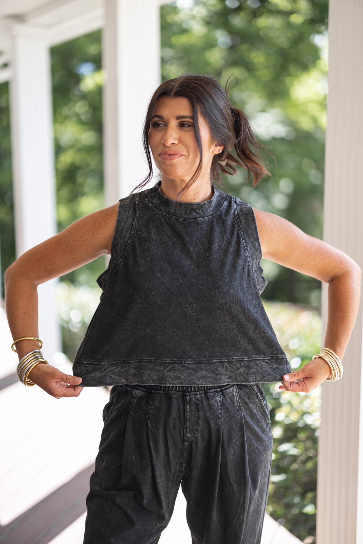 Elevate your style with the perfect blend of comfort and sophistication with our chic sleeveless cropped top. Crafted from breathable fabric, this trendy top is not only stylish but also incredibly comfy. The mineral wash adds a unique touch, giving it a distinct and fashionable look. Pair it effortlessly with the matching pants for a complete ensemble that's perfect for the spa, lounging at home, casual outings, picnics, or wherever your day takes you!