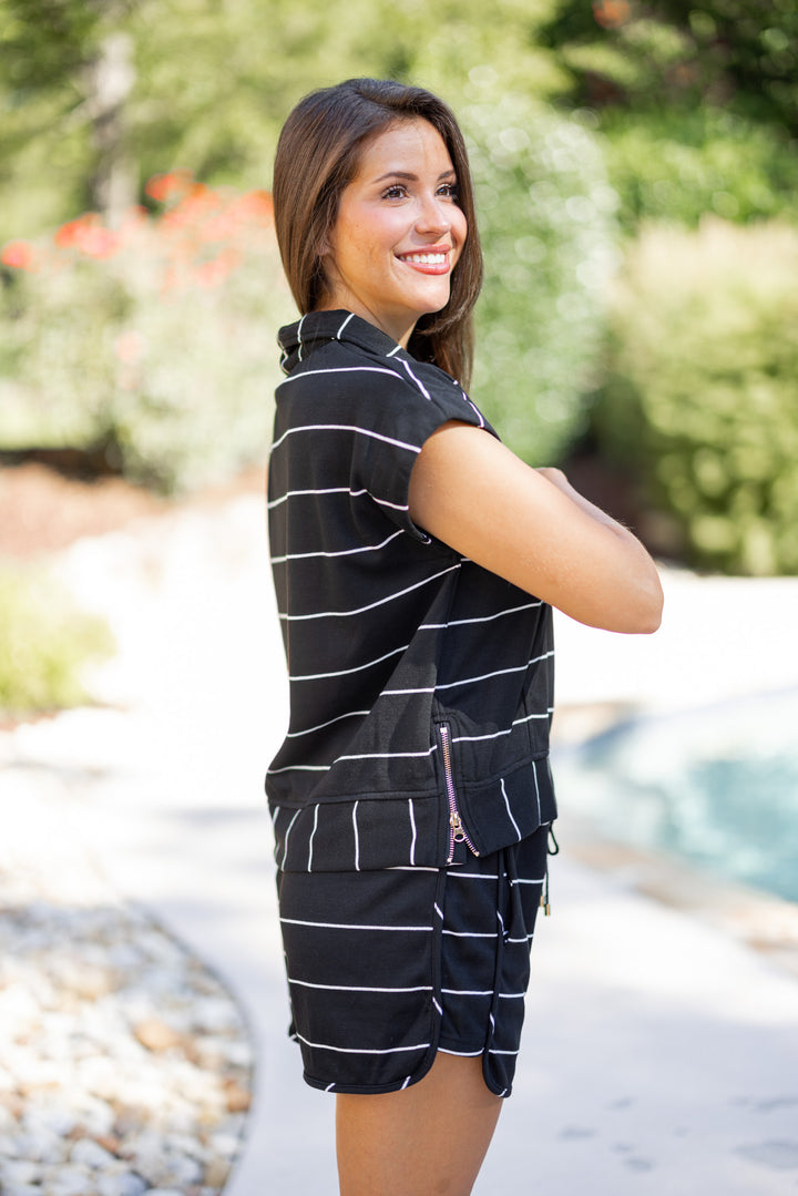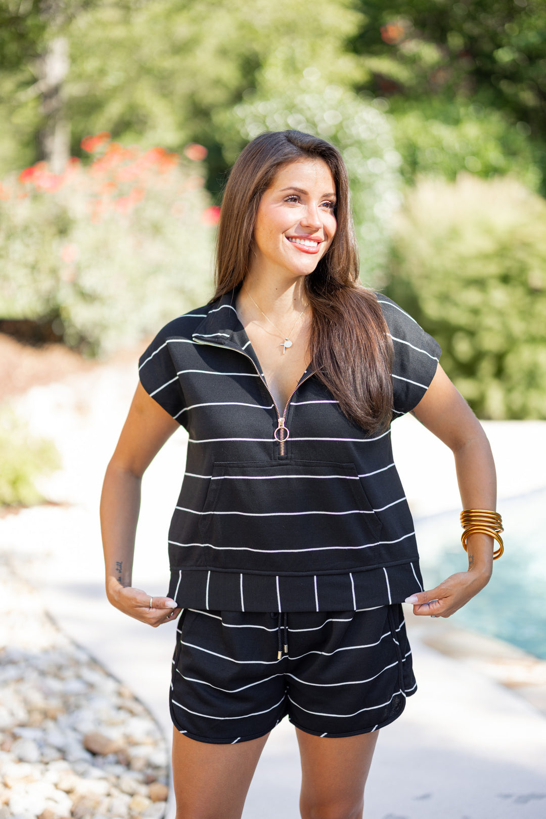 Fall in love with the comfort and style of our Midnight Stroll top! Made with black and cream striped terry knit fabric, this babe features a zip front bodice, short sleeves, a front kangaroo pocket, and zipper side slits in the bottom hem. Too perfect! Complete the look with our matching shorts for a super stylish outfit. Just right with sneakers for casual activities.