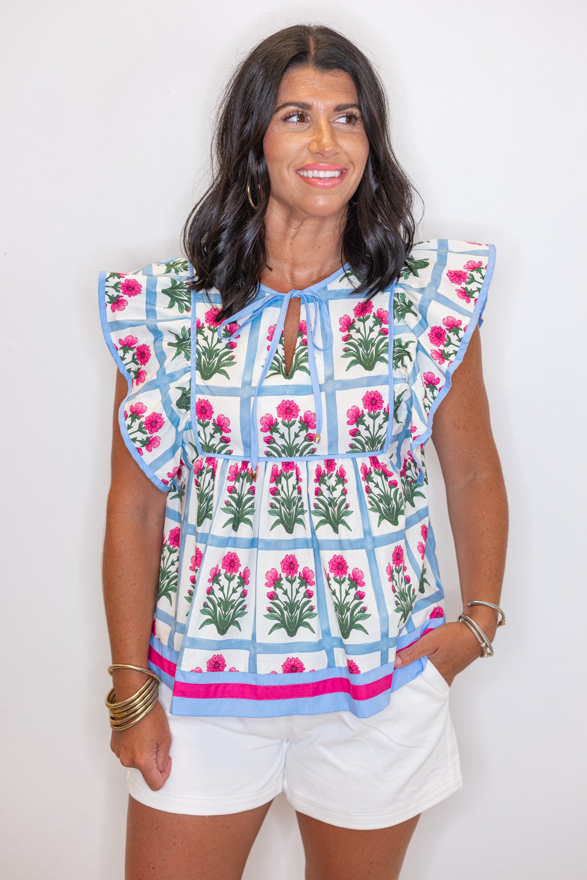 Show off your Floral style in this adorable Blossoming Squares Magenta Babydoll Top! Featuring a v cut neckline with self tie detail in front, and ruffle flutter sleeves. The breezy cream fabric with magenta pink and green floral print in washed light blue squares makes this babe the prettiest top for Summer!