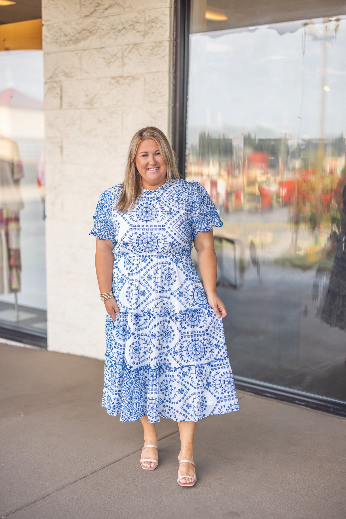 Be the center of attention in this playful Blue Embroidered Sass Midi Dress! Made from lightweight white fabric with charming blue embroidered floral print and eyelet details. The ruffle trimmed crew neckline and layered sleeves add a touch of fun while the ruffle tiered skirt will have you twirling all day long. Bring on the compliments!