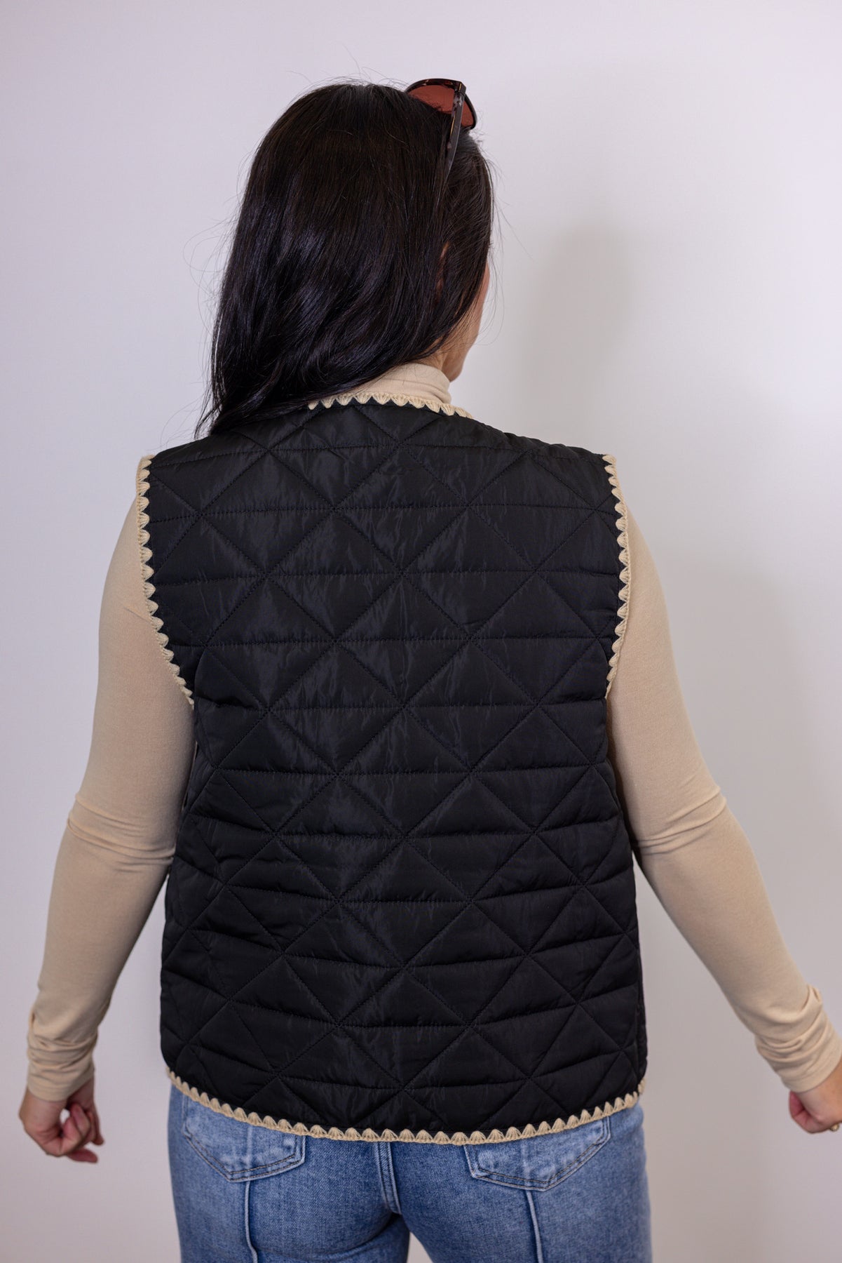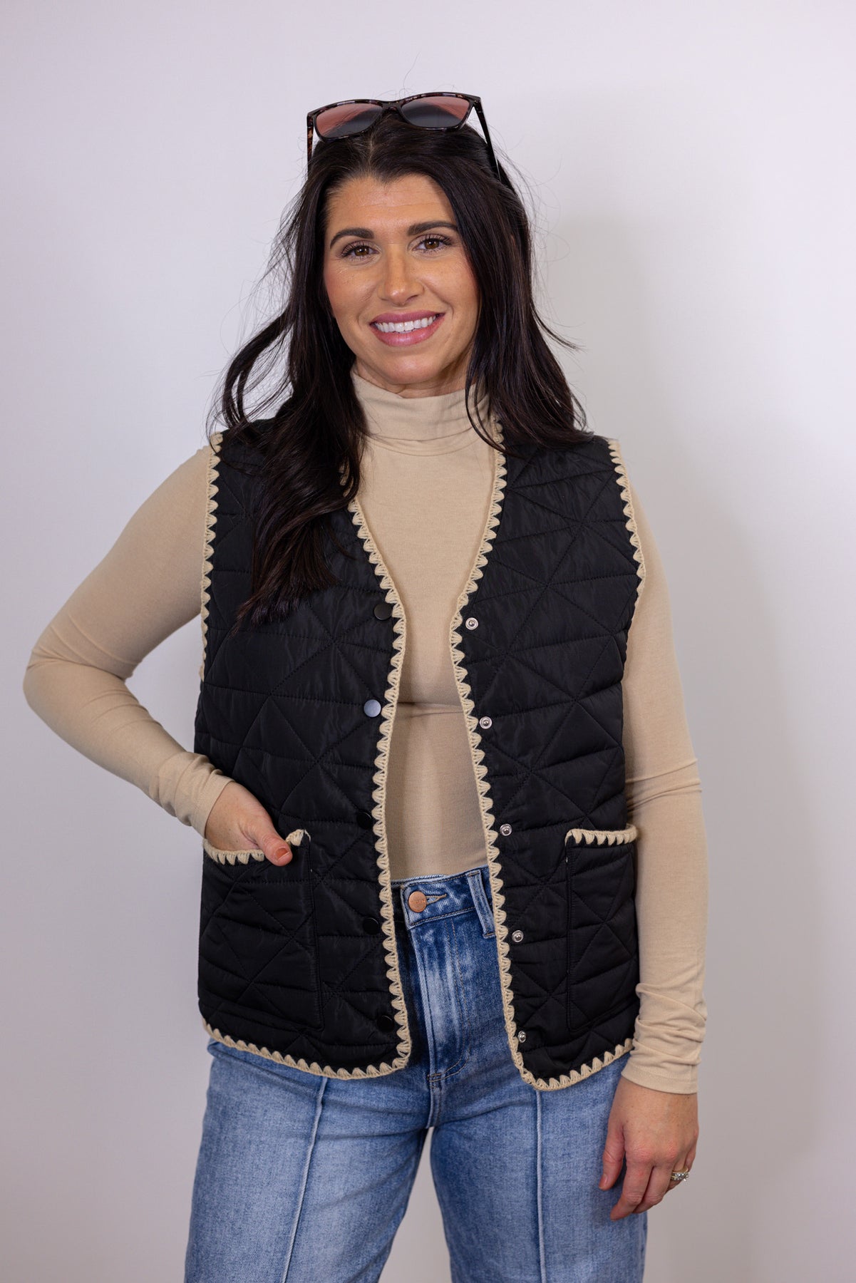 Be the cutest one at the bonfire in our black Bonfire Favorite quilted vest! Stylish and functional, she'll keep you warm while staying trendy! Featuring front pockets, a snap front closure, and beige scalloped embroidery trim. Looks amazing styled over THIS DRESS, too!
