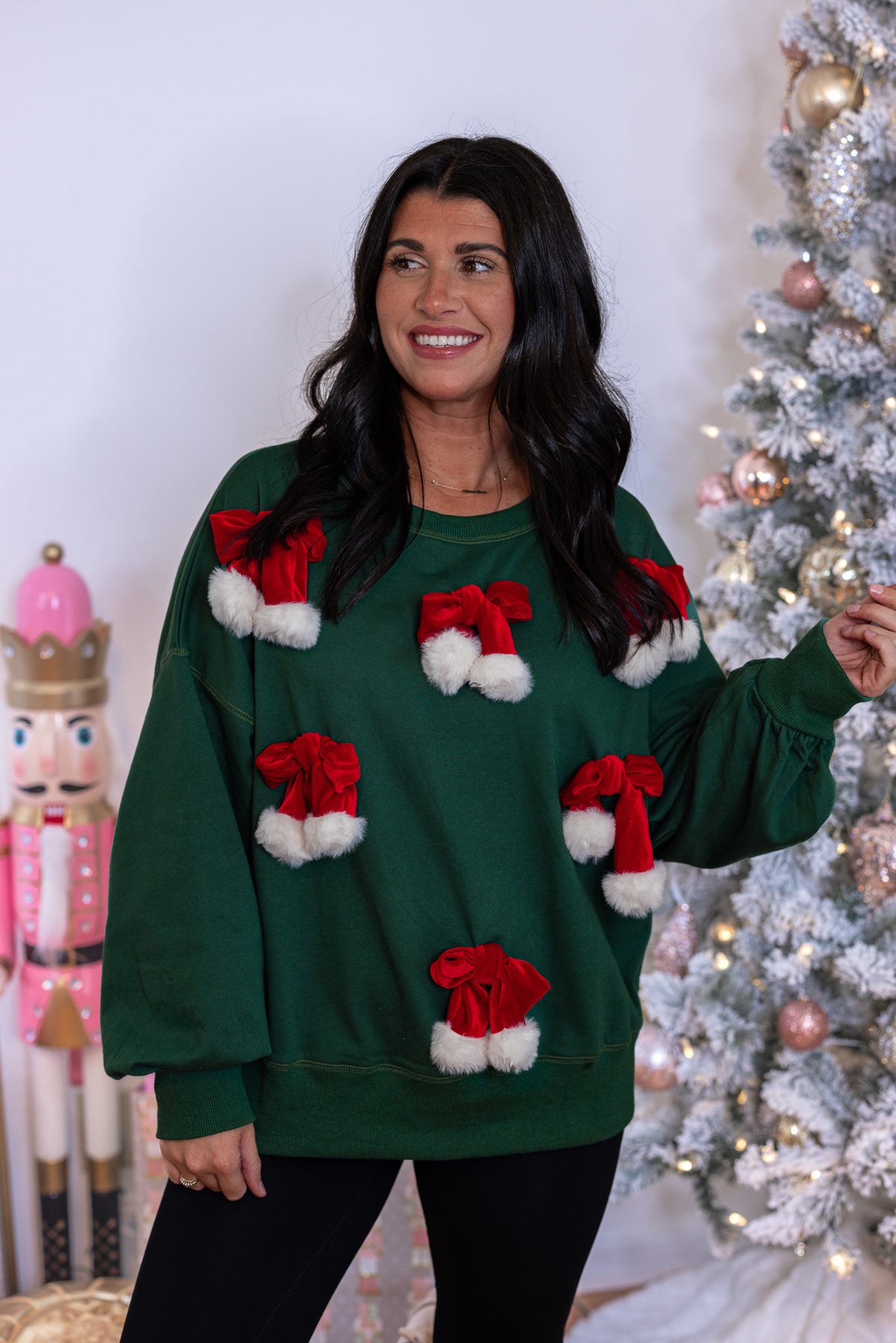 Unleash your Magical Style with this Bow Tie sweatshirt! Made with cozy hunter green french terry knit fabric, and featuring 3D bow ties of red velvet and cream fur, that add a unique touch to the classic crew neckline and long sleeves. Perfect for a quirky and playful look all season long!